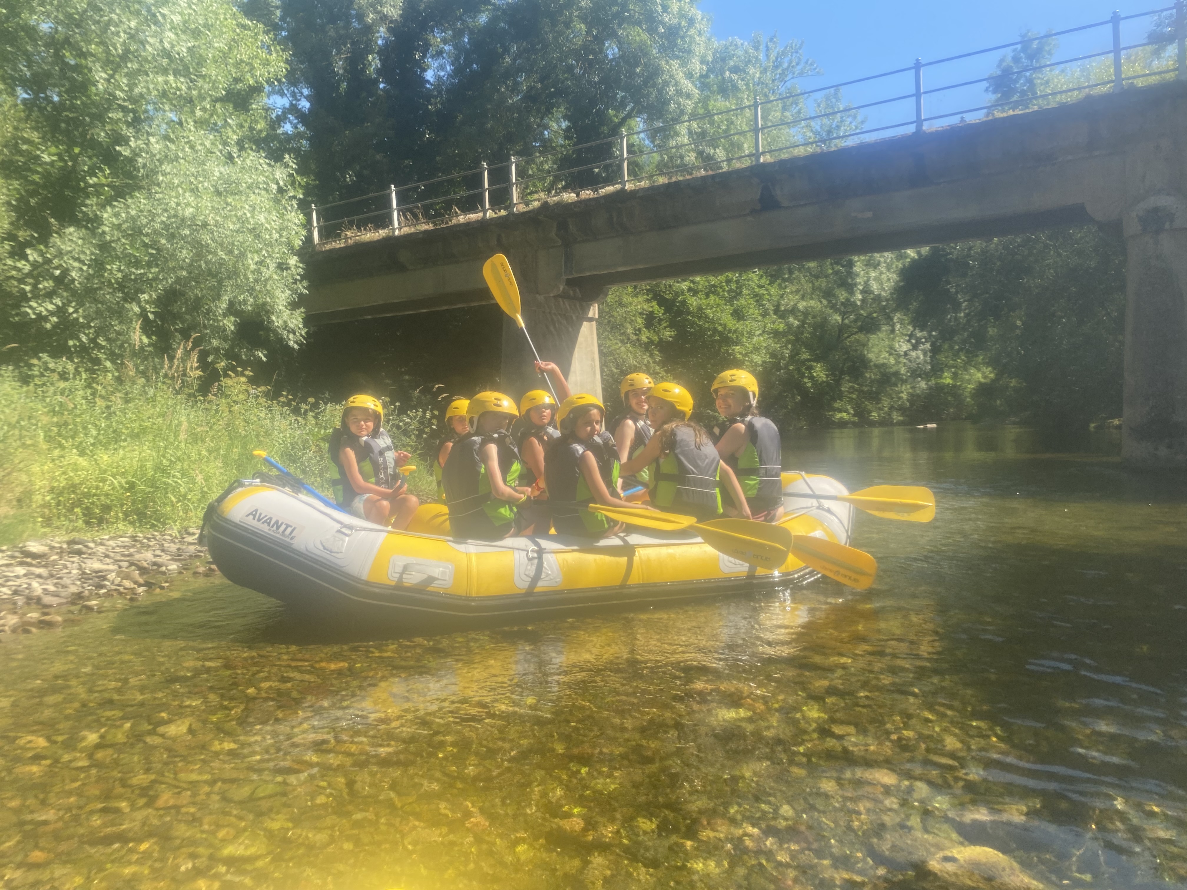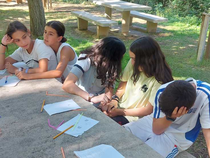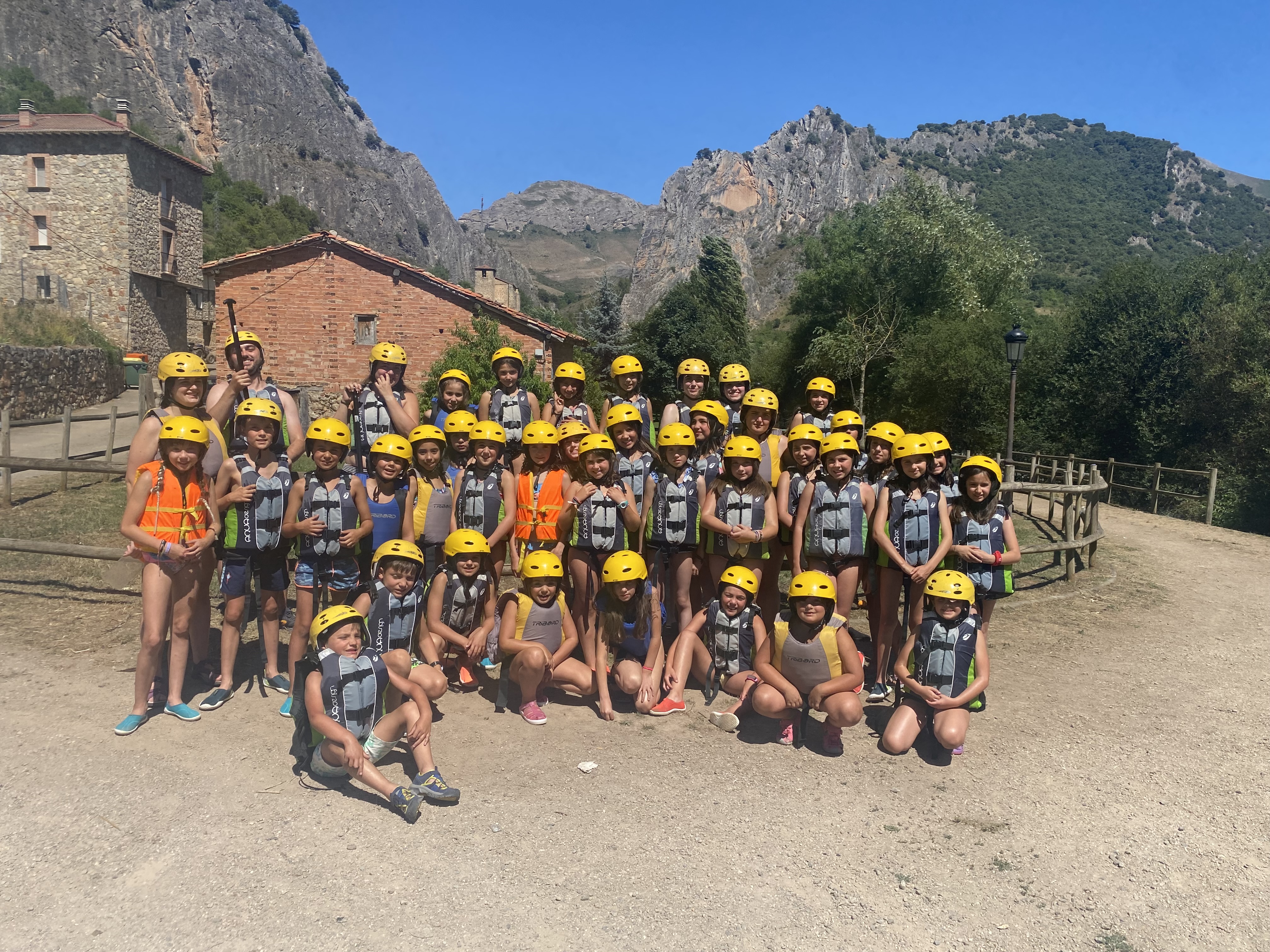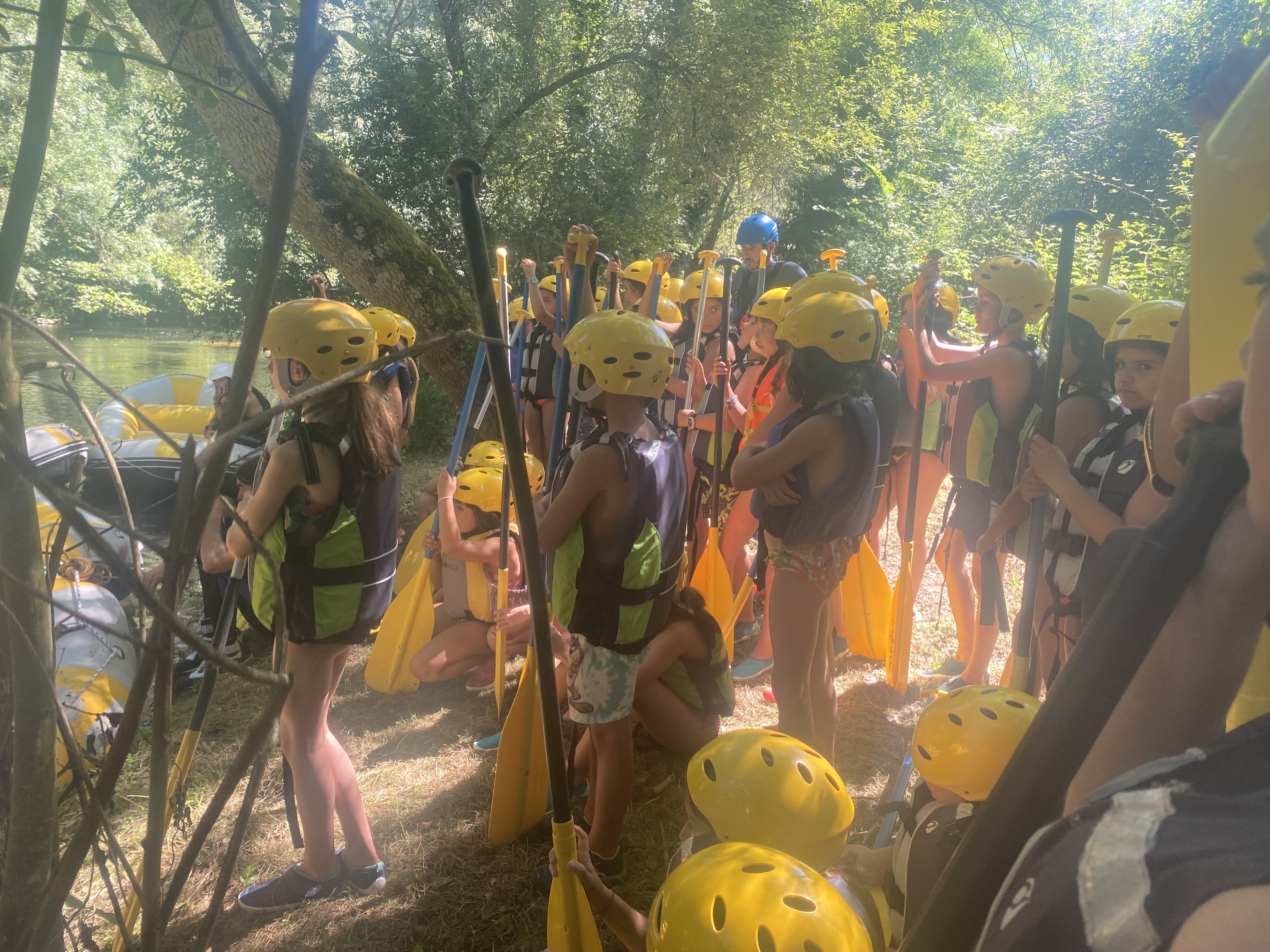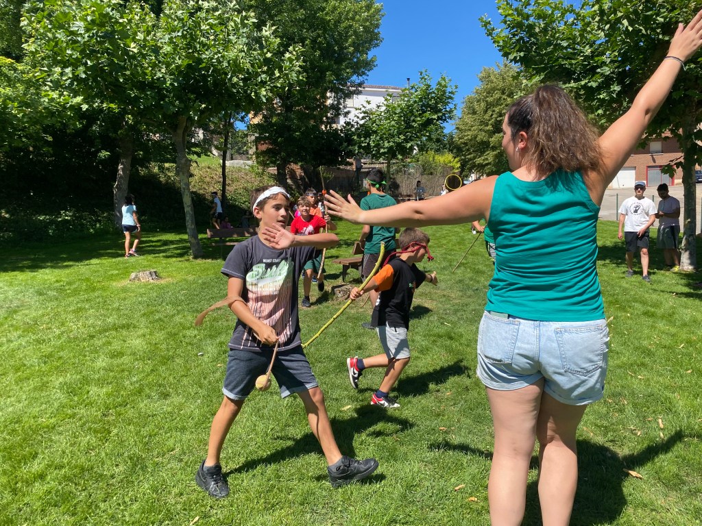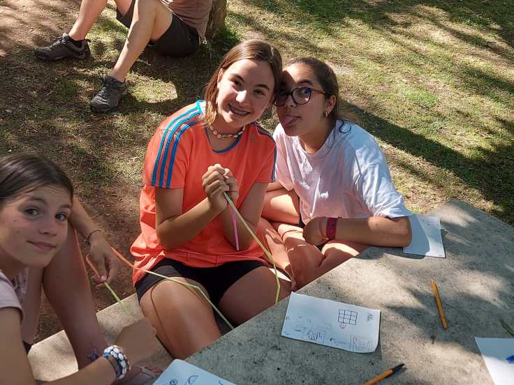 El tercer día tocó cambiar los papeles. Mientras esta vez eran los mayores los que se quedaban en el campamento preparando pociones y tiñendo camisetas, los pequeños salían rumbo a Anguiano. Desde allí, emprendieron el camino que llevaba hasta la cueva de un tal Nuño, que al parecer se había olvidado allí el burro y los caballos. Al volver a Anguiano, se montaron en unos botes para practicar rafting en el río Najerilla. Aprendieron a remar, rescatar a gente del agua e incluso a dejarse llevar por la corriente. Al volver al campa, los mayores contaron que habían estado en la piscina. Ya juntos, por la noche, jugamos a dos juegos míticos y tradicionales del campa: el ogro y el agujero negro.