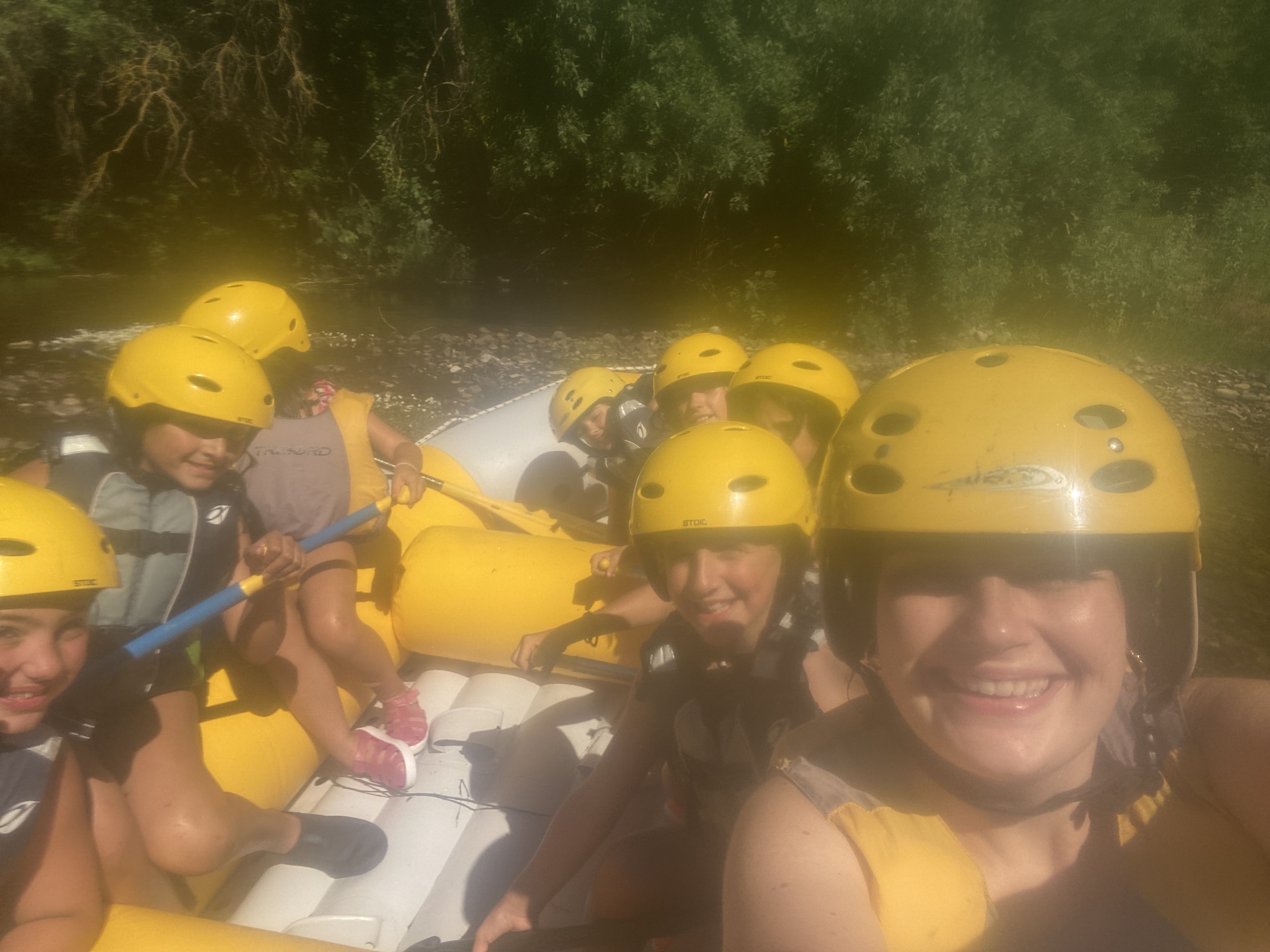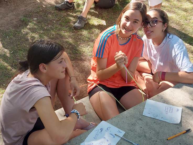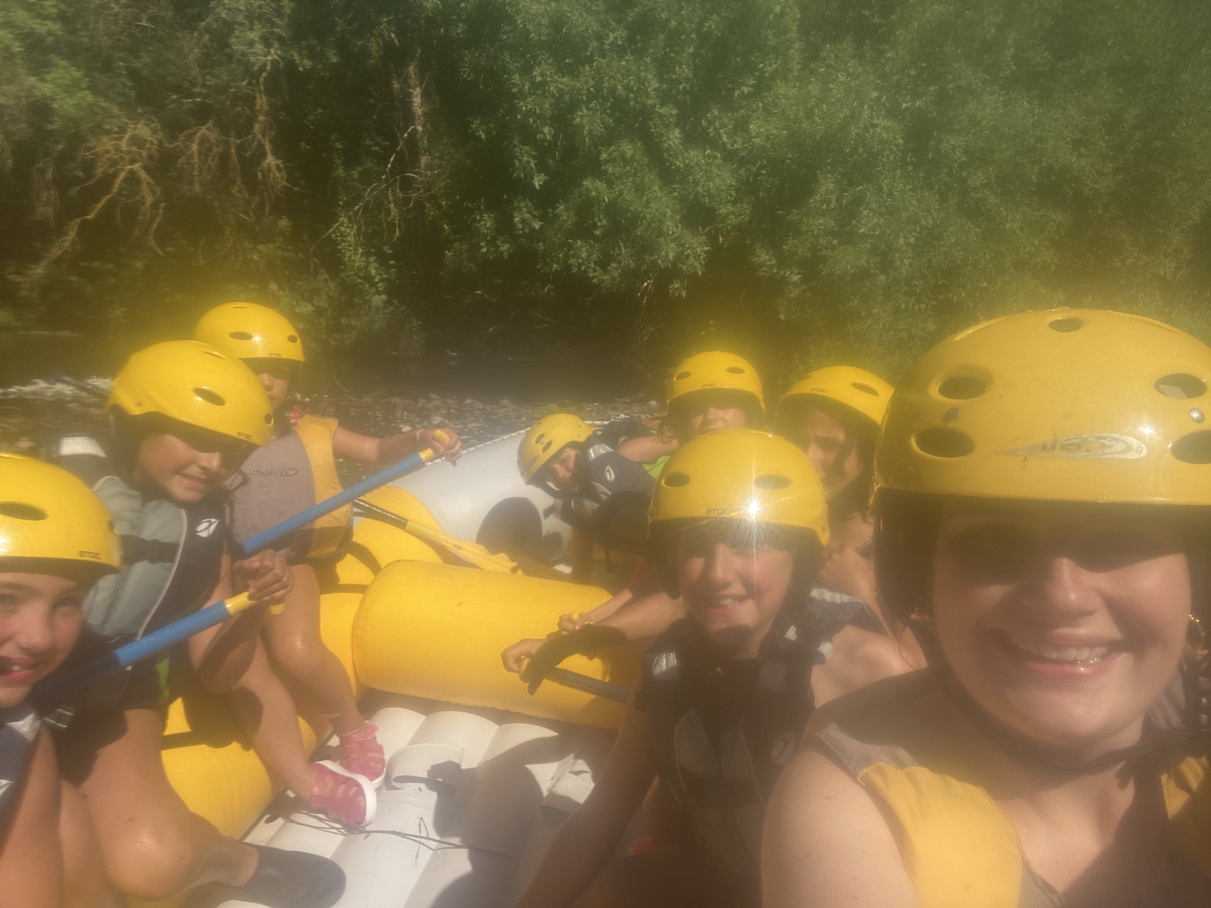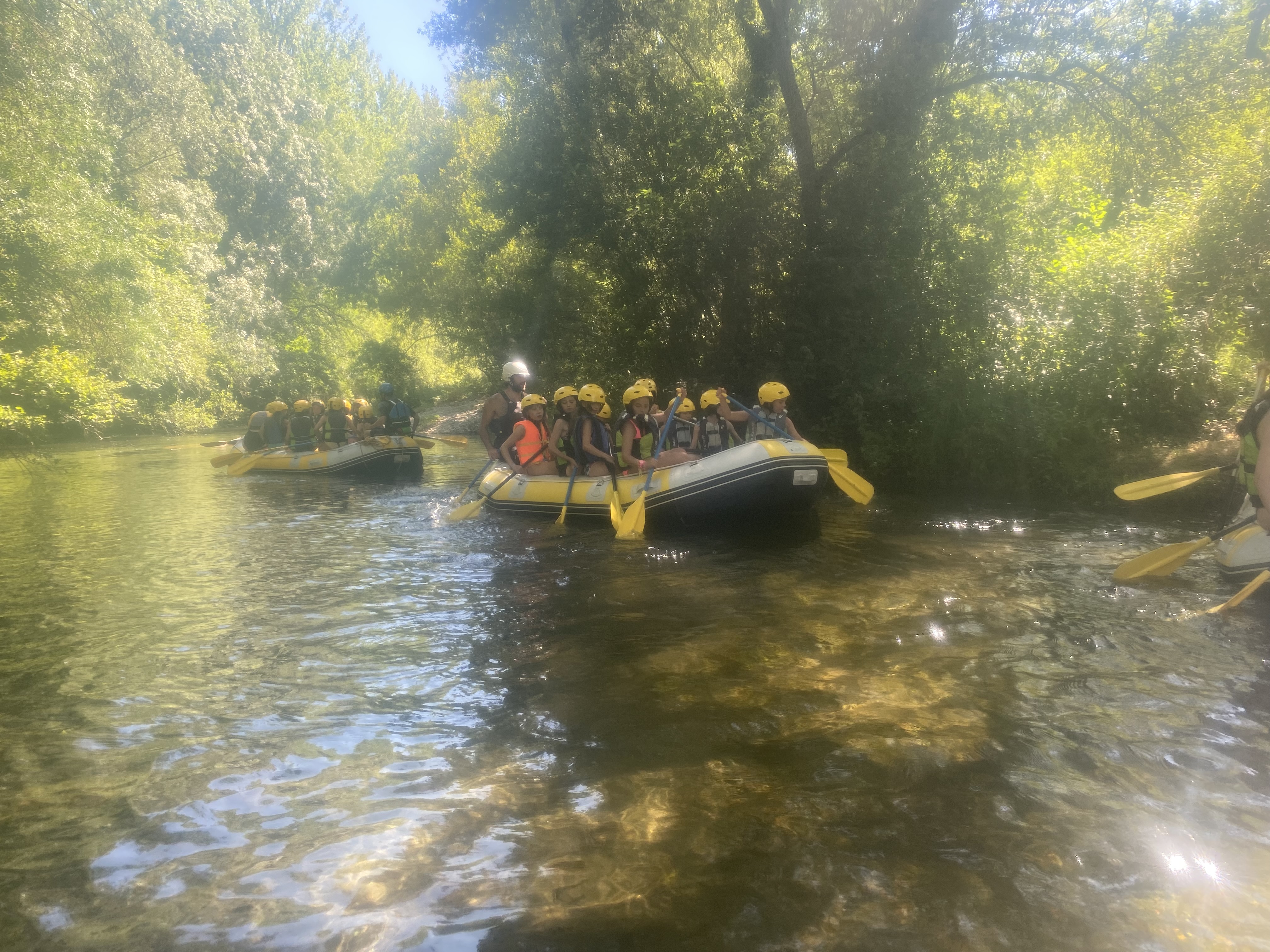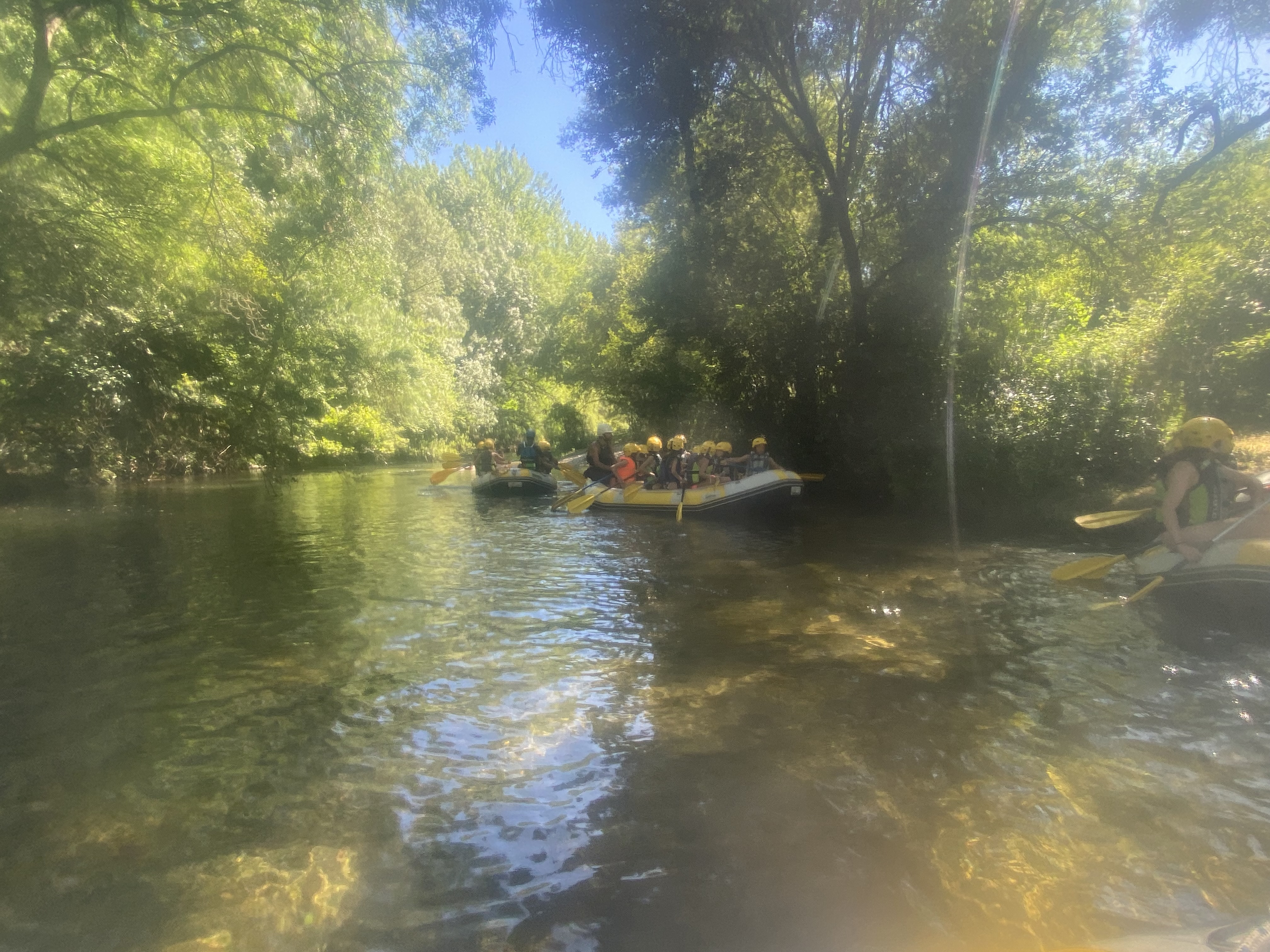 El tercer día tocó cambiar los papeles. Mientras esta vez eran los mayores los que se quedaban en el campamento preparando pociones y tiñendo camisetas, los pequeños salían rumbo a Anguiano. Desde allí, emprendieron el camino que llevaba hasta la cueva de un tal Nuño, que al parecer se había olvidado allí el burro y los caballos. Al volver a Anguiano, se montaron en unos botes para practicar rafting en el río Najerilla. Aprendieron a remar, rescatar a gente del agua e incluso a dejarse llevar por la corriente. Al volver al campa, los mayores contaron que habían estado en la piscina. Ya juntos, por la noche, jugamos a dos juegos míticos y tradicionales del campa: el ogro y el agujero negro.
