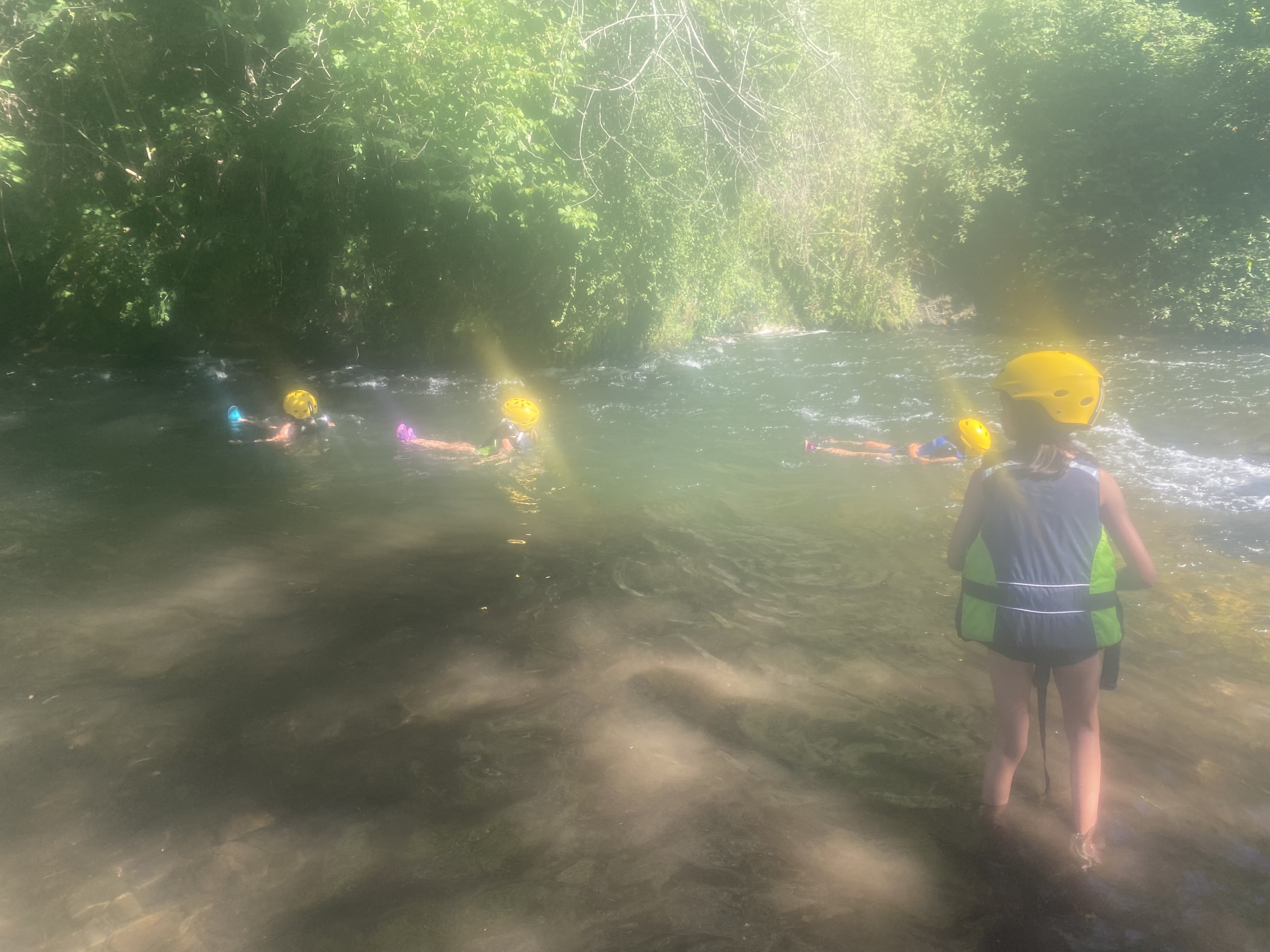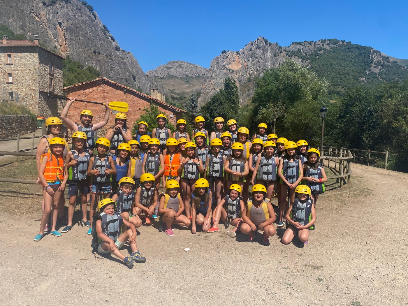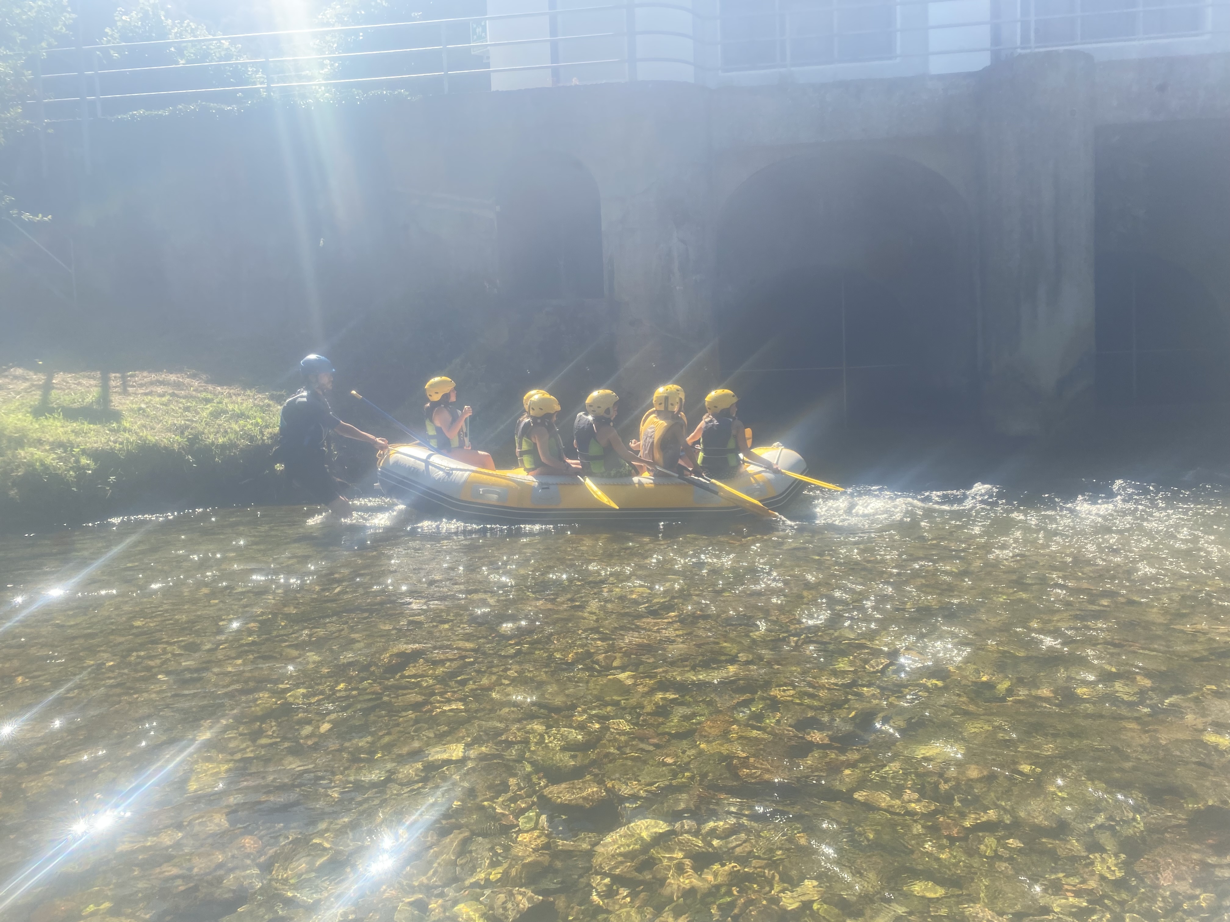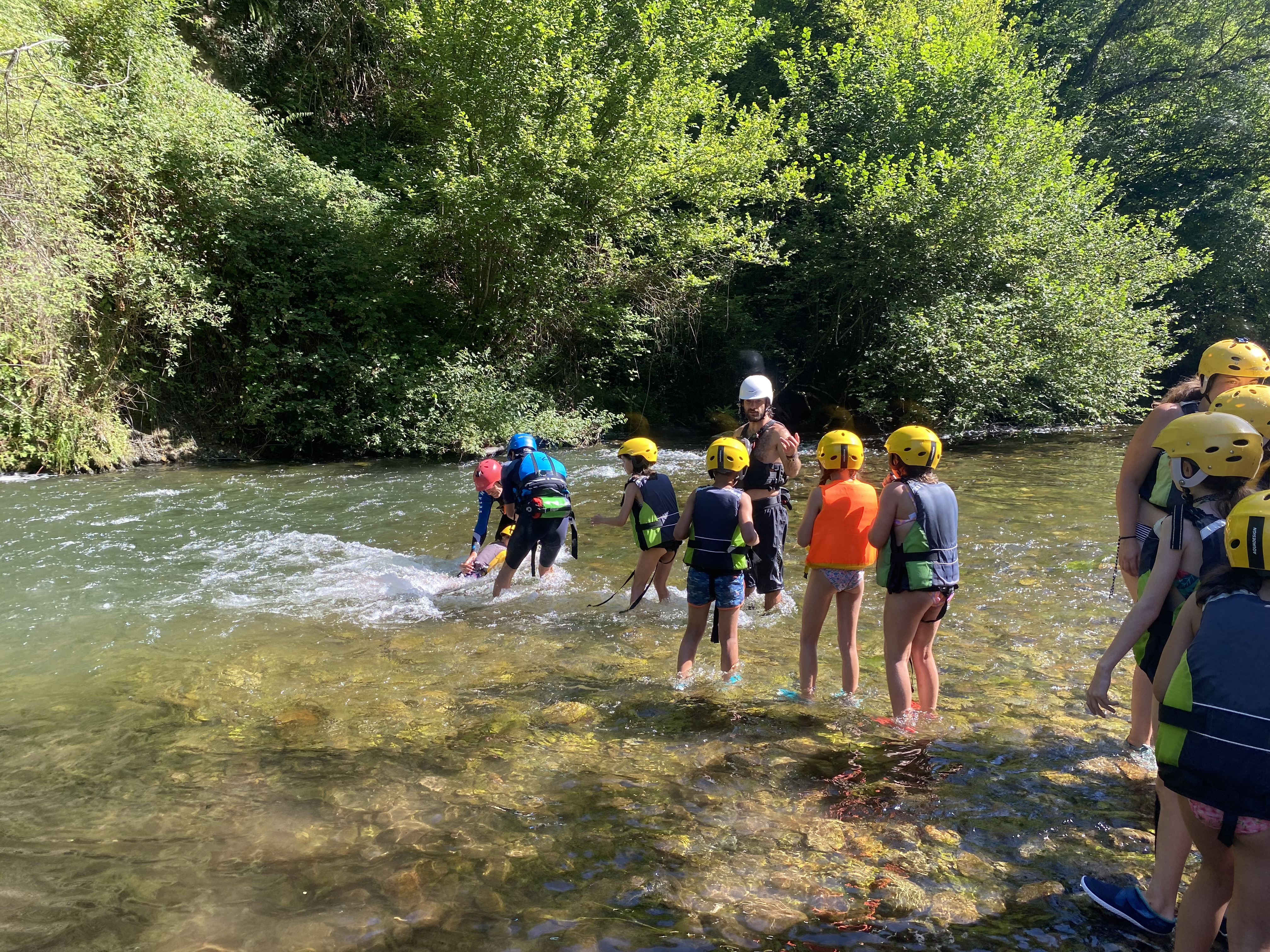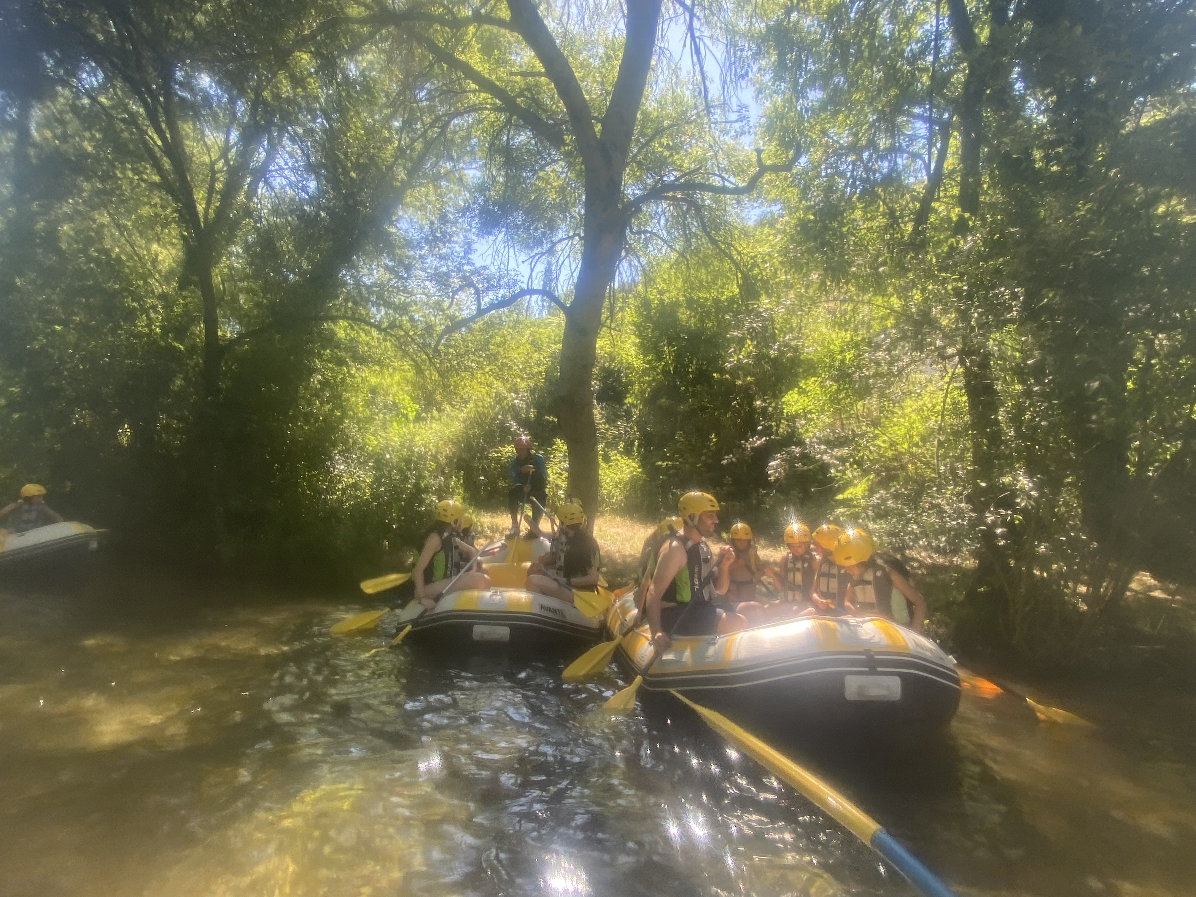 El tercer día tocó cambiar los papeles. Mientras esta vez eran los mayores los que se quedaban en el campamento preparando pociones y tiñendo camisetas, los pequeños salían rumbo a Anguiano. Desde allí, emprendieron el camino que llevaba hasta la cueva de un tal Nuño, que al parecer se había olvidado allí el burro y los caballos. Al volver a Anguiano, se montaron en unos botes para practicar rafting en el río Najerilla. Aprendieron a remar, rescatar a gente del agua e incluso a dejarse llevar por la corriente. Al volver al campa, los mayores contaron que habían estado en la piscina. Ya juntos, por la noche, jugamos a dos juegos míticos y tradicionales del campa: el ogro y el agujero negro.