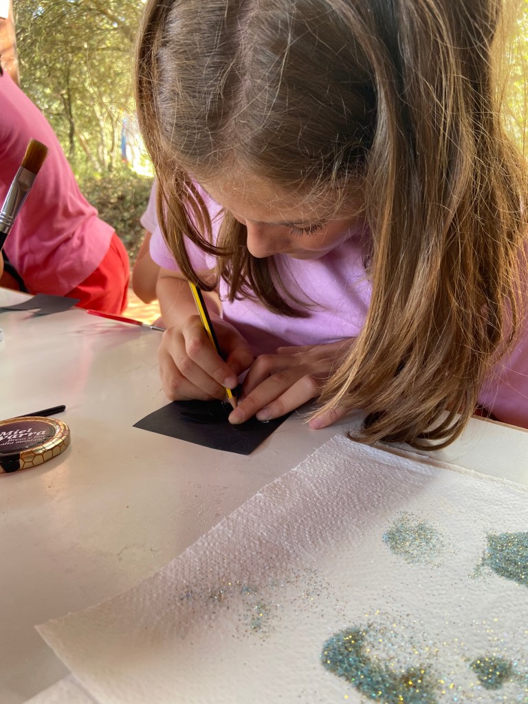 Después, hemos realizado dos talleres mágicos: unos llaveros decorados con las caras de los animalillos del bosque y unos tarros con hadas en su interior.