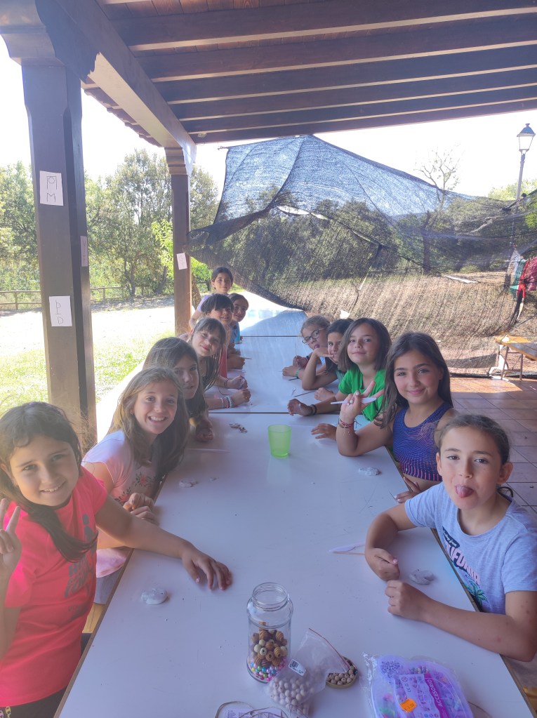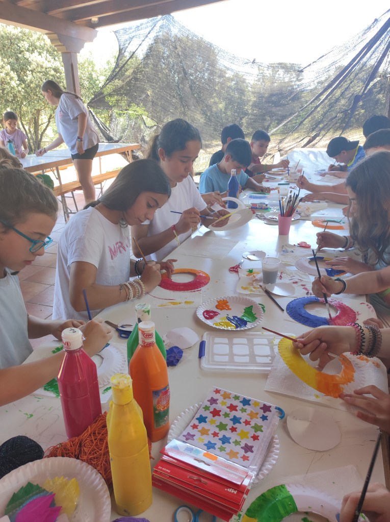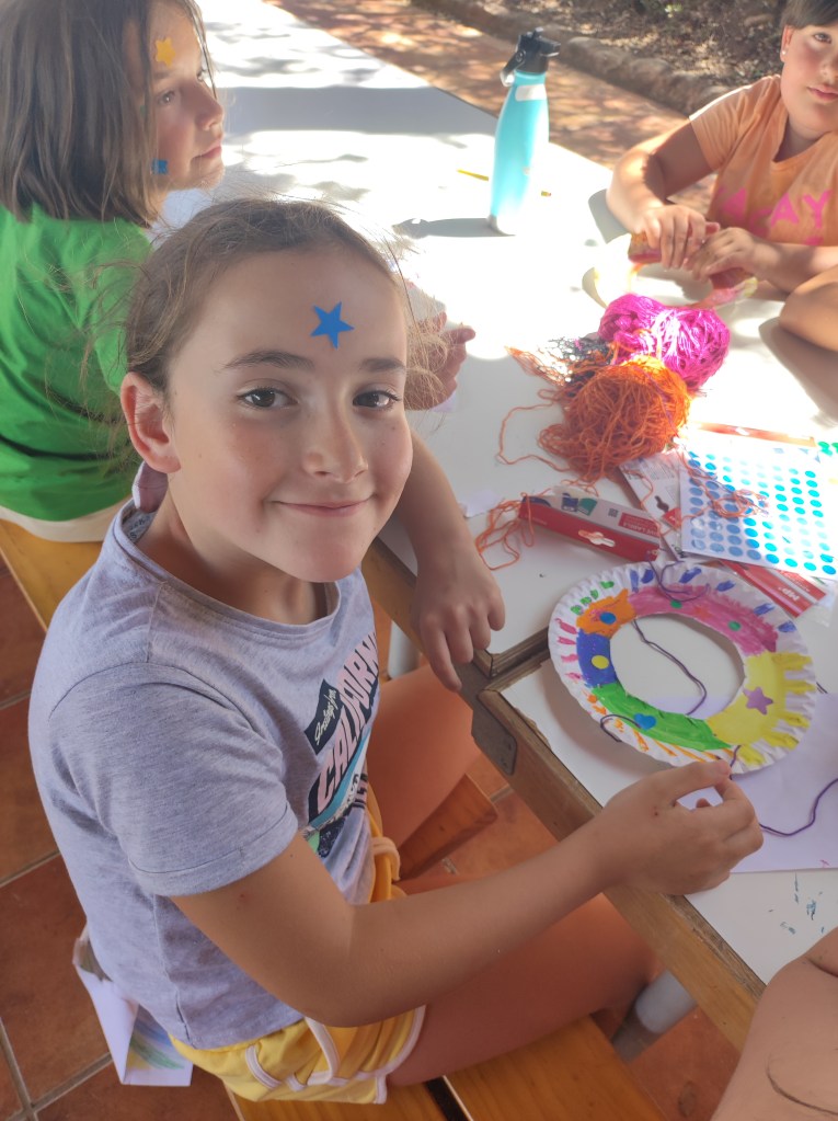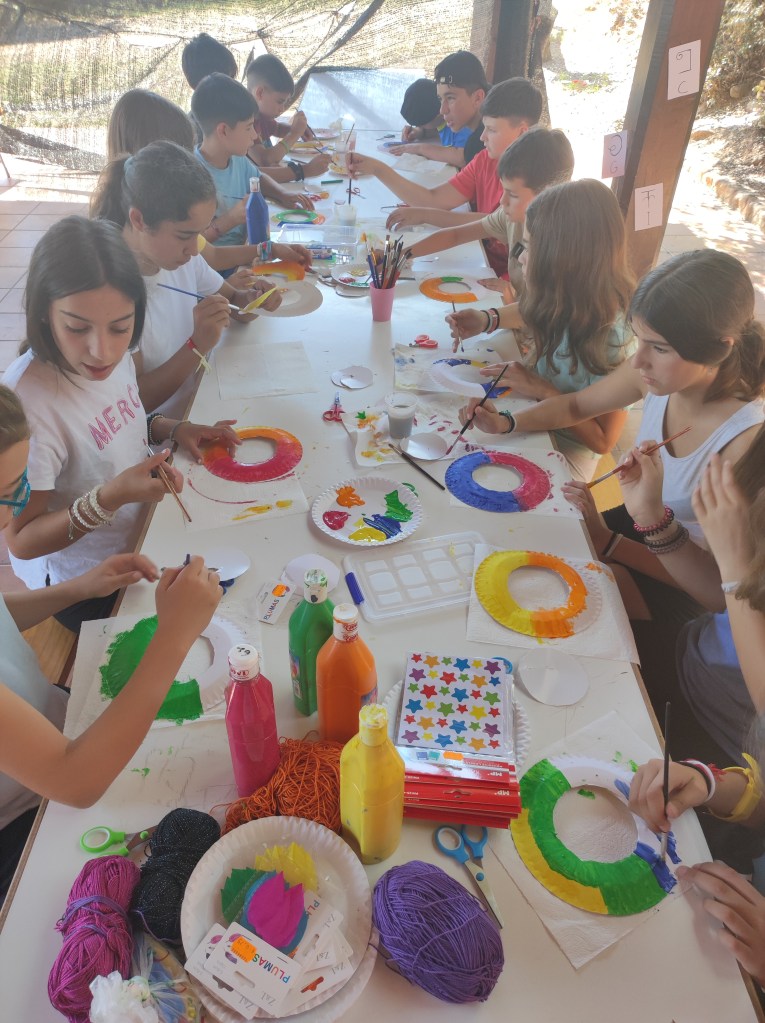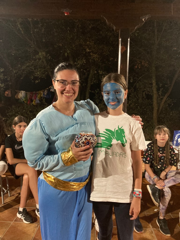 Buenos días familias, hoy hemos cruzado el portal para conocer el mundo de Arabia. Hemos comenzado con una buena clase de yoga para activarnos. Tras el desayuno nos hemos puesto a realizar tareas y ordenar las tiendas para poder comenzar los talleres. Cada acampado pudo hacer volar su imaginación para realizar un atrapasueños y un llavero de la mano de Fátima. Como hacía mucho calor almorzamos melón y sandía para refrescarnos y a continuación realizamos una pequeña gymkana de las mil y una noches.