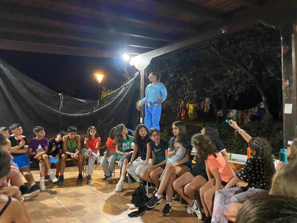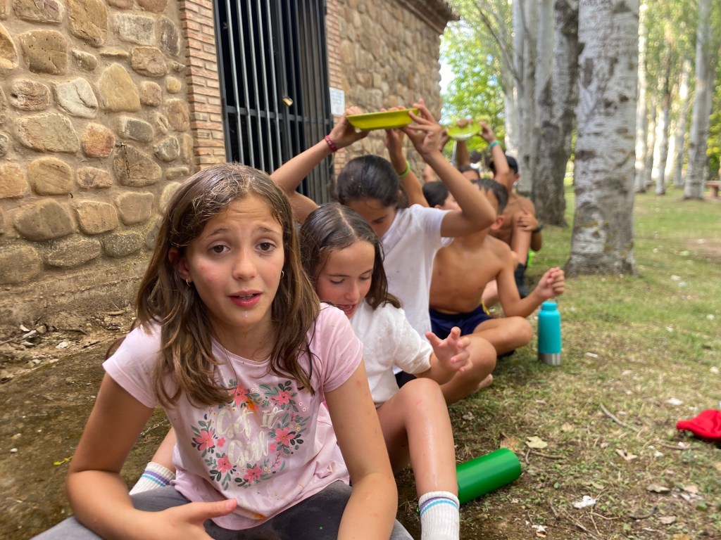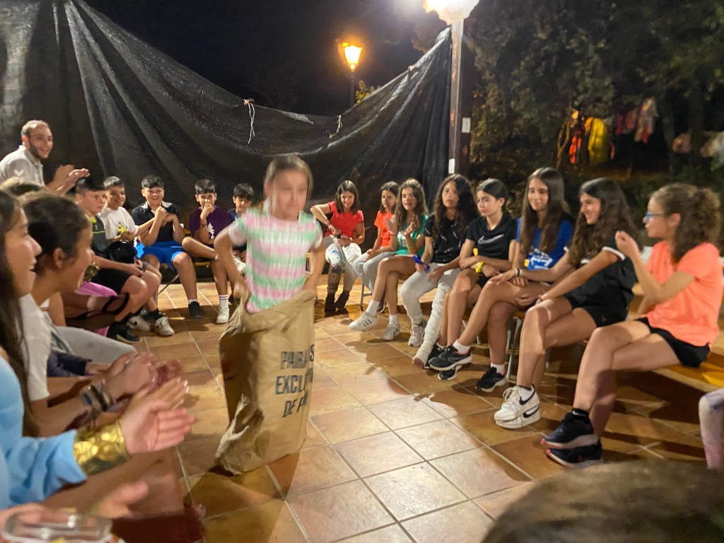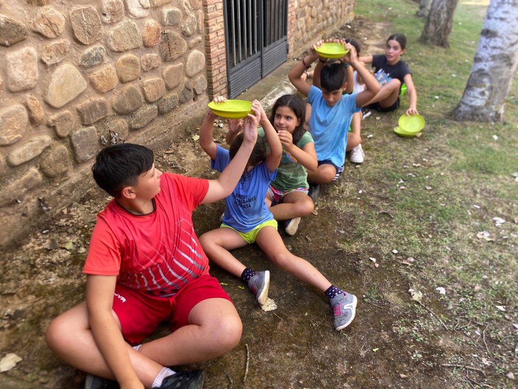 Para comer nos esperaba ensalada de primero y pinchos morunos de segundo y de postre una pieza de fruta a elegir entre plátano y melocotón. En el tiempo libre aprovechamos para escribirle cartas a nuestro amigo invisible o a algún compañero acampado, y también cantamos y bailamos algunas de nuestras canciones favoritas. Para poder conseguir los alimentos para la cena, hicimos una gymkana donde en cada prueba podían elegir si querían ese alimento para su cena o no, con esto conseguimos que se pusiesen de acuerdo con su grupo para poder cenar con lo que más les gustaba. Afortunadamente todos los grupos consiguieron cenar kebab y unas natillas de postre.