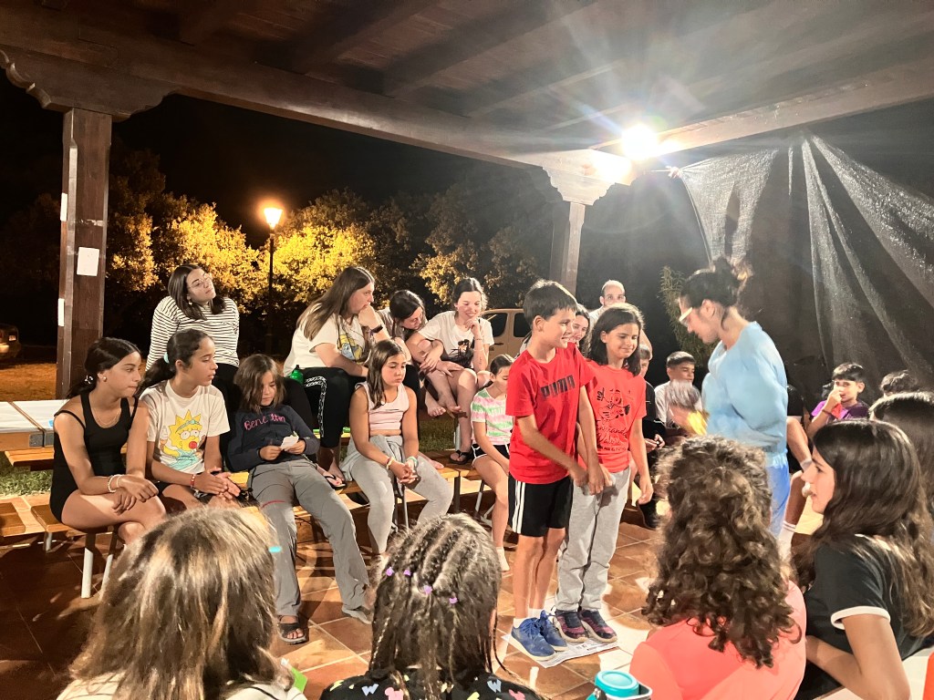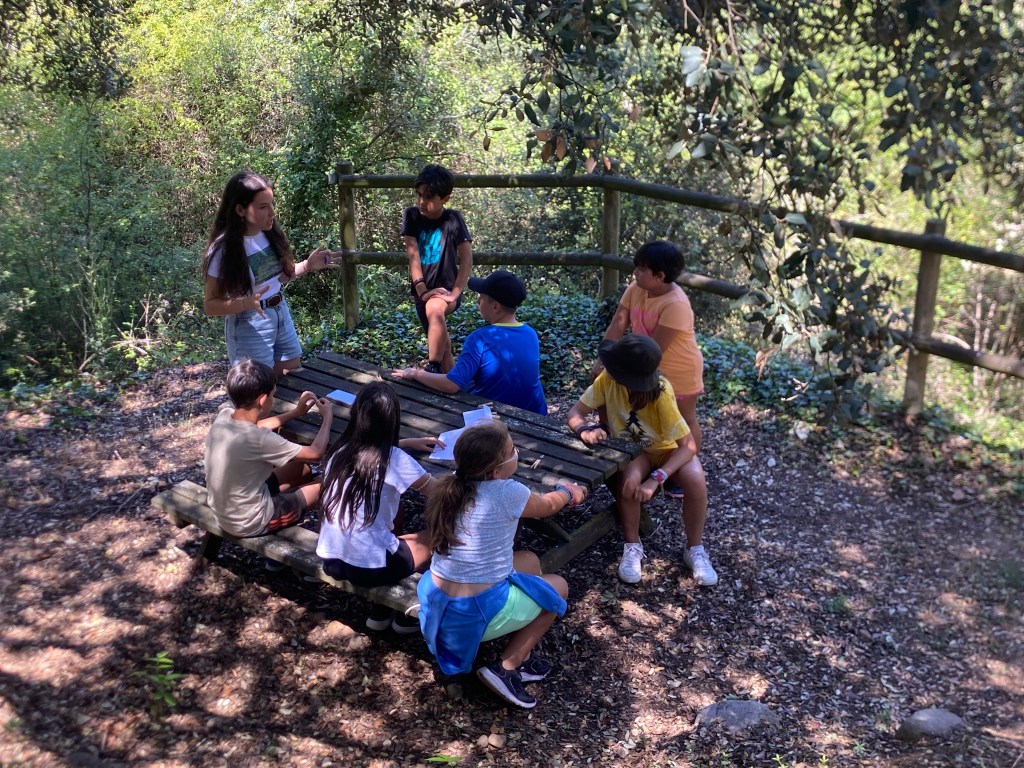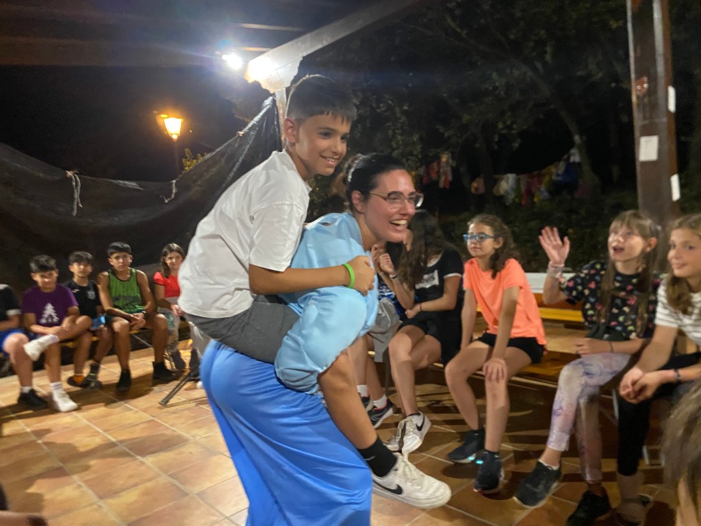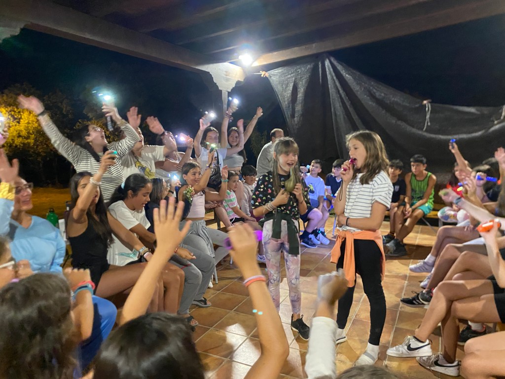 Para comer nos esperaba ensalada de primero y pinchos morunos de segundo y de postre una pieza de fruta a elegir entre plátano y melocotón. En el tiempo libre aprovechamos para escribirle cartas a nuestro amigo invisible o a algún compañero acampado, y también cantamos y bailamos algunas de nuestras canciones favoritas. Para poder conseguir los alimentos para la cena, hicimos una gymkana donde en cada prueba podían elegir si querían ese alimento para su cena o no, con esto conseguimos que se pusiesen de acuerdo con su grupo para poder cenar con lo que más les gustaba. Afortunadamente todos los grupos consiguieron cenar kebab y unas natillas de postre.