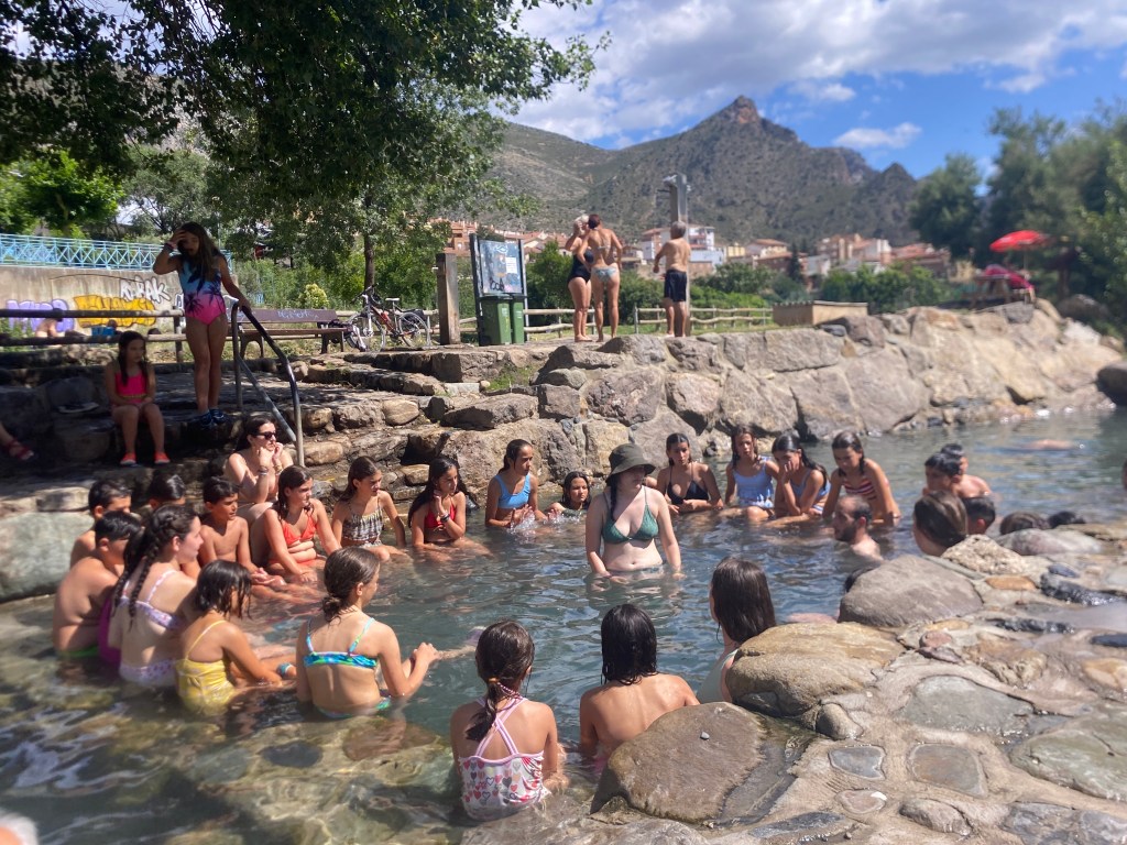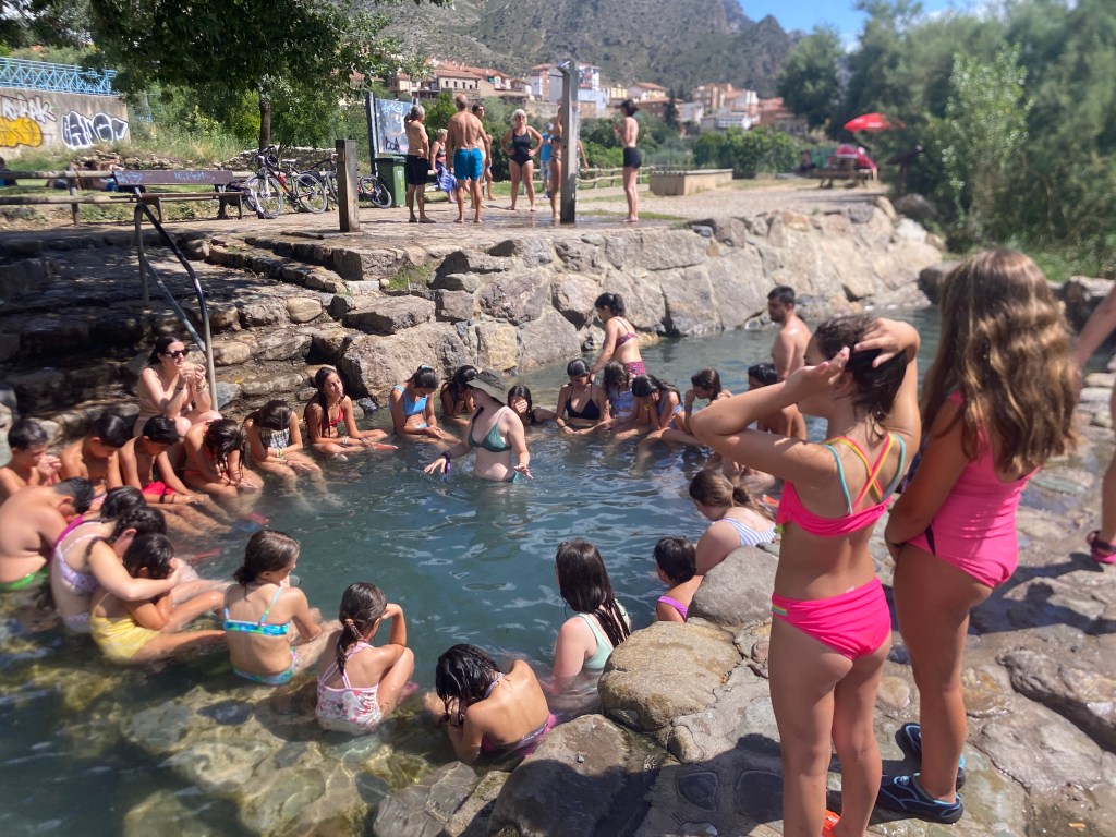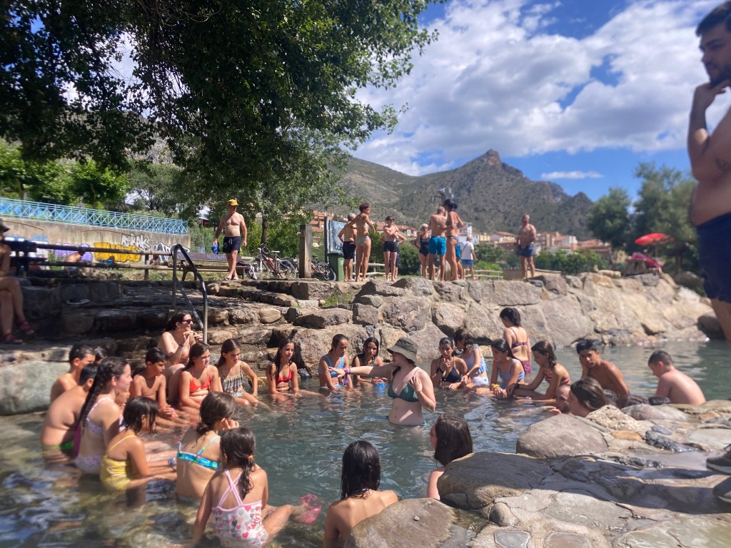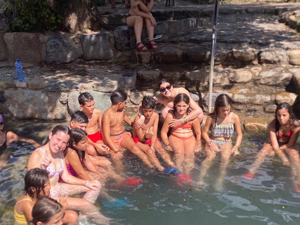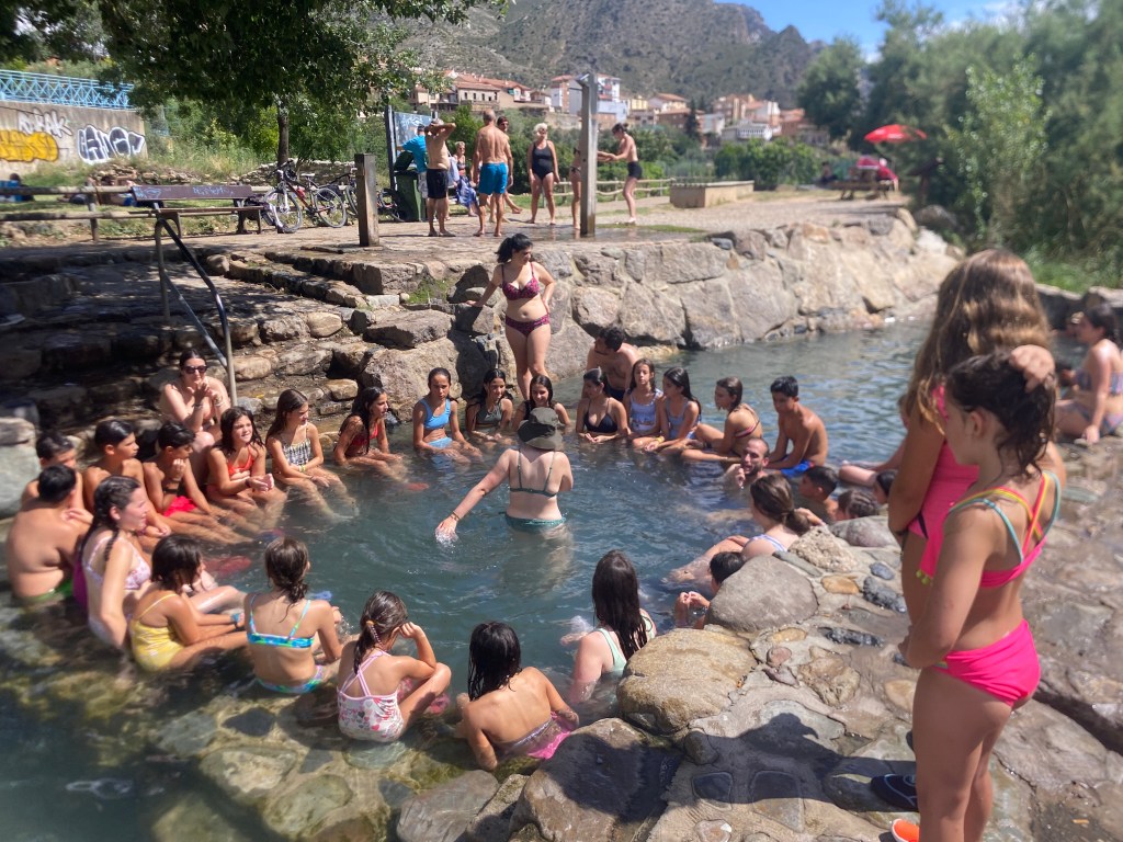 Tras recargar fuerzas con el desayuno, nos esperaba un autobús para llevarnos hasta nuestro destino, las pozas de Arnedillo. Allí nos bañamos todos juntos en las aguas termales, y como sirenas y tritones jugamos un asesino dentro del agua. Pasamos toda la mañana ahí. Para comer, Paola y Joanes nos prepararon una rica y completa ensalada de pasta al gusto. ¡Parecía que estábamos en un buffet!