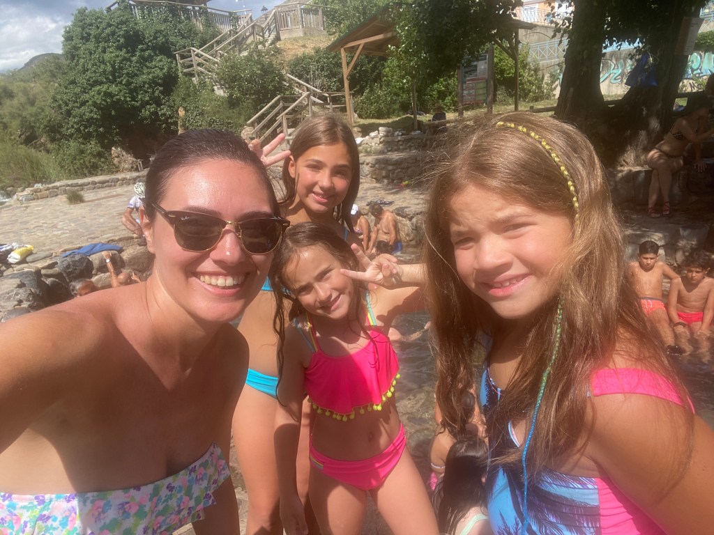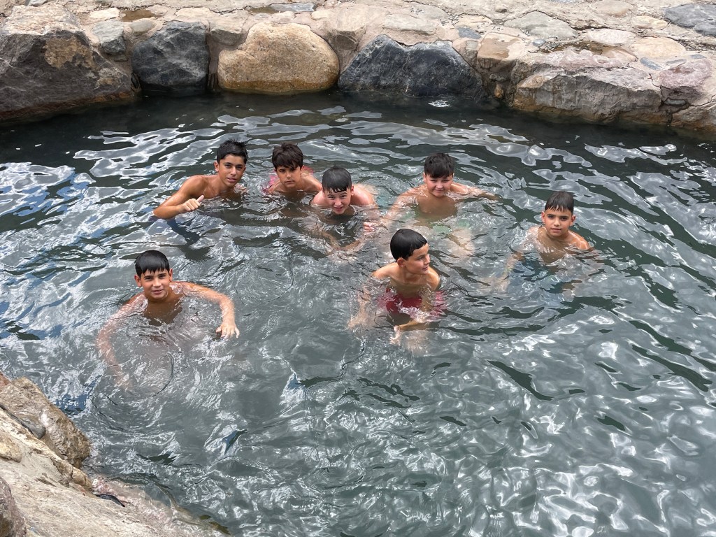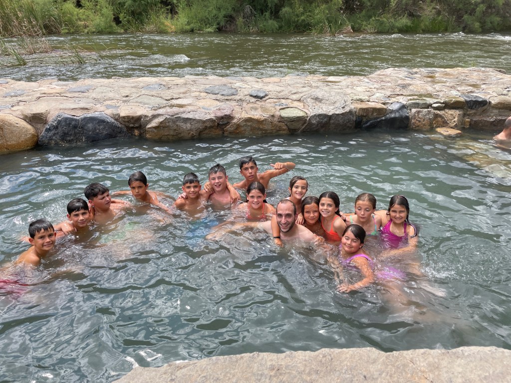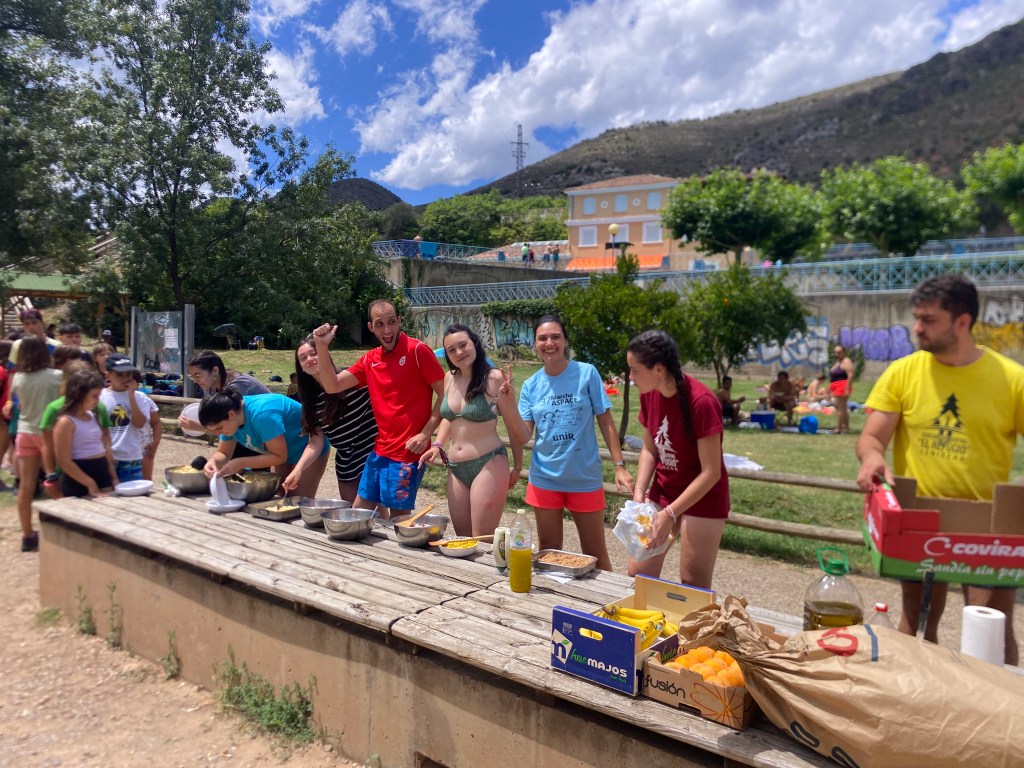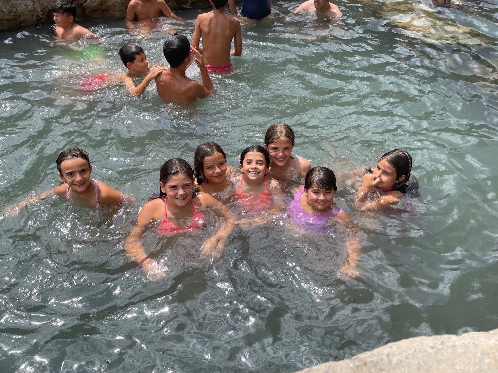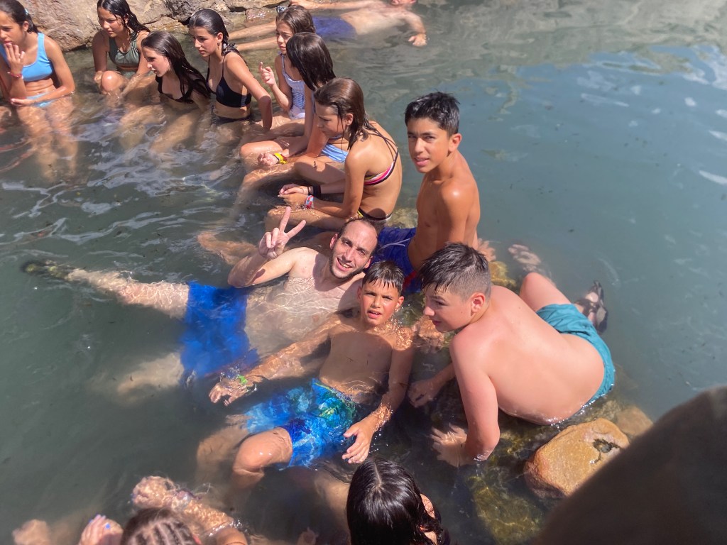 Tras recargar fuerzas con el desayuno, nos esperaba un autobús para llevarnos hasta nuestro destino, las pozas de Arnedillo. Allí nos bañamos todos juntos en las aguas termales, y como sirenas y tritones jugamos un asesino dentro del agua. Pasamos toda la mañana ahí. Para comer, Paola y Joanes nos prepararon una rica y completa ensalada de pasta al gusto. ¡Parecía que estábamos en un buffet!