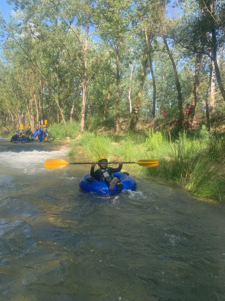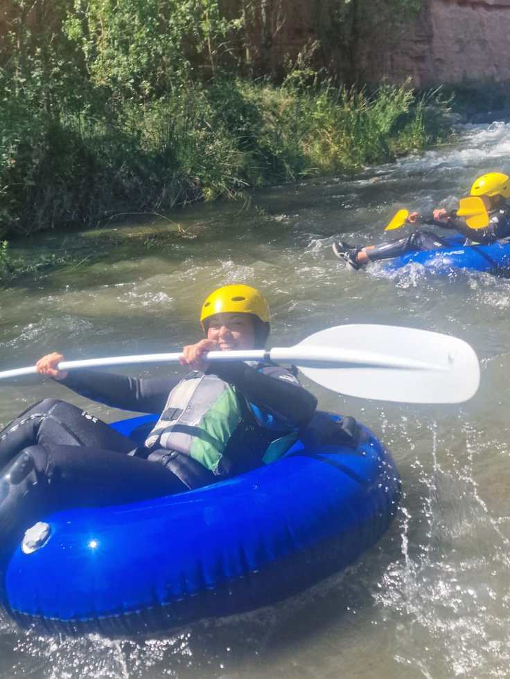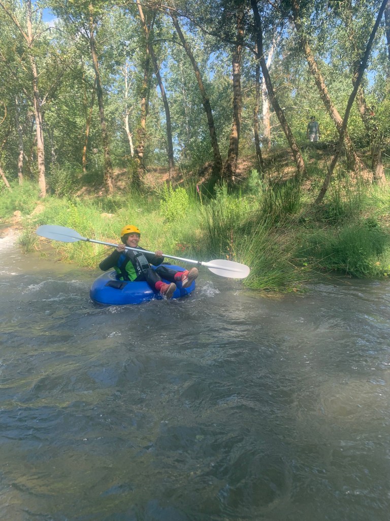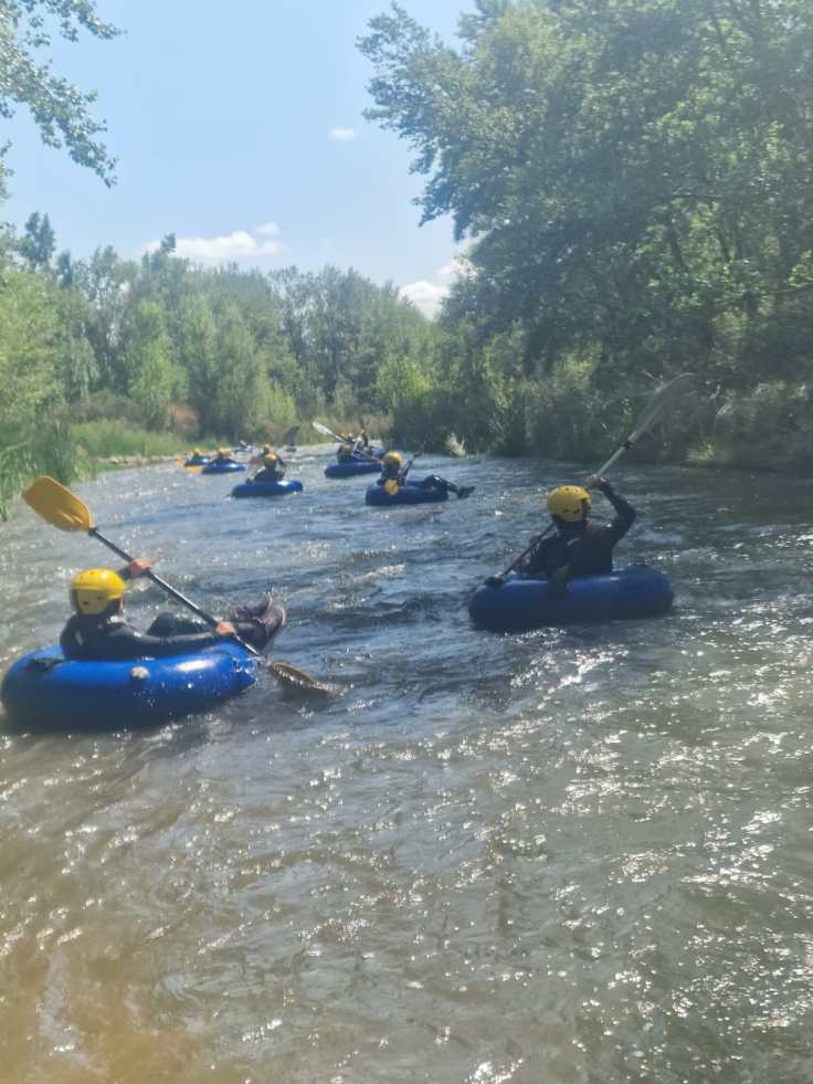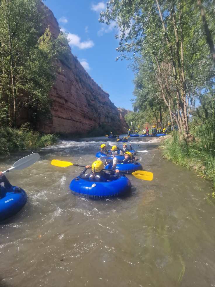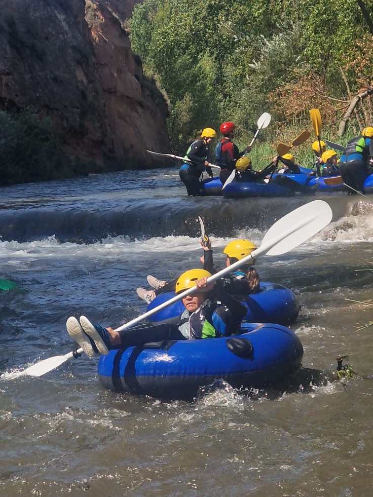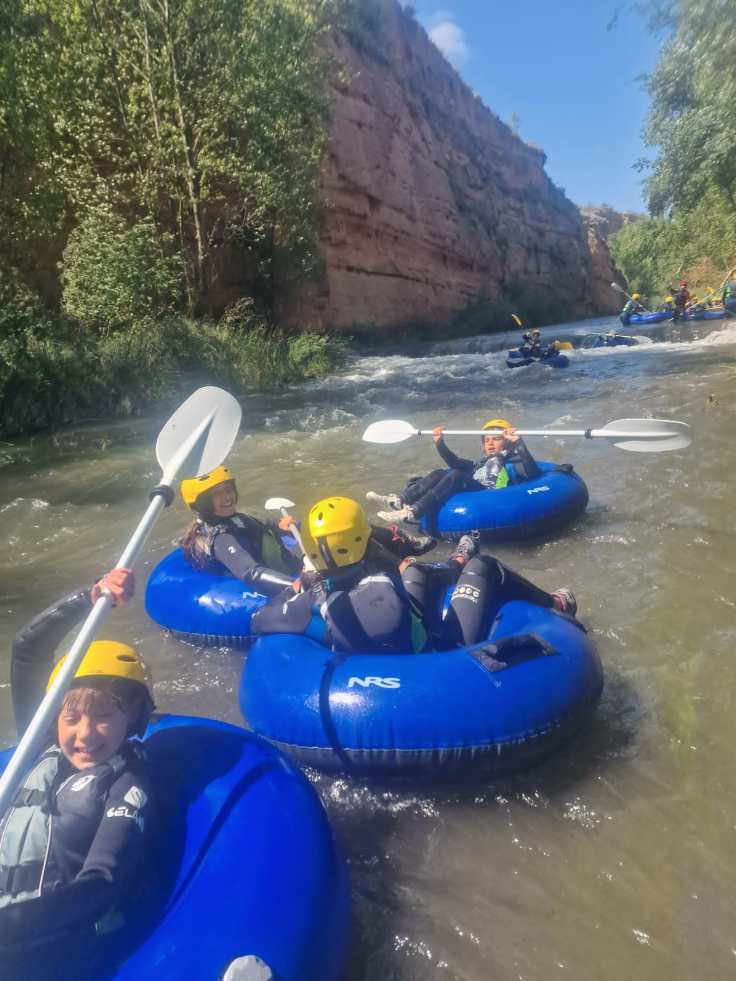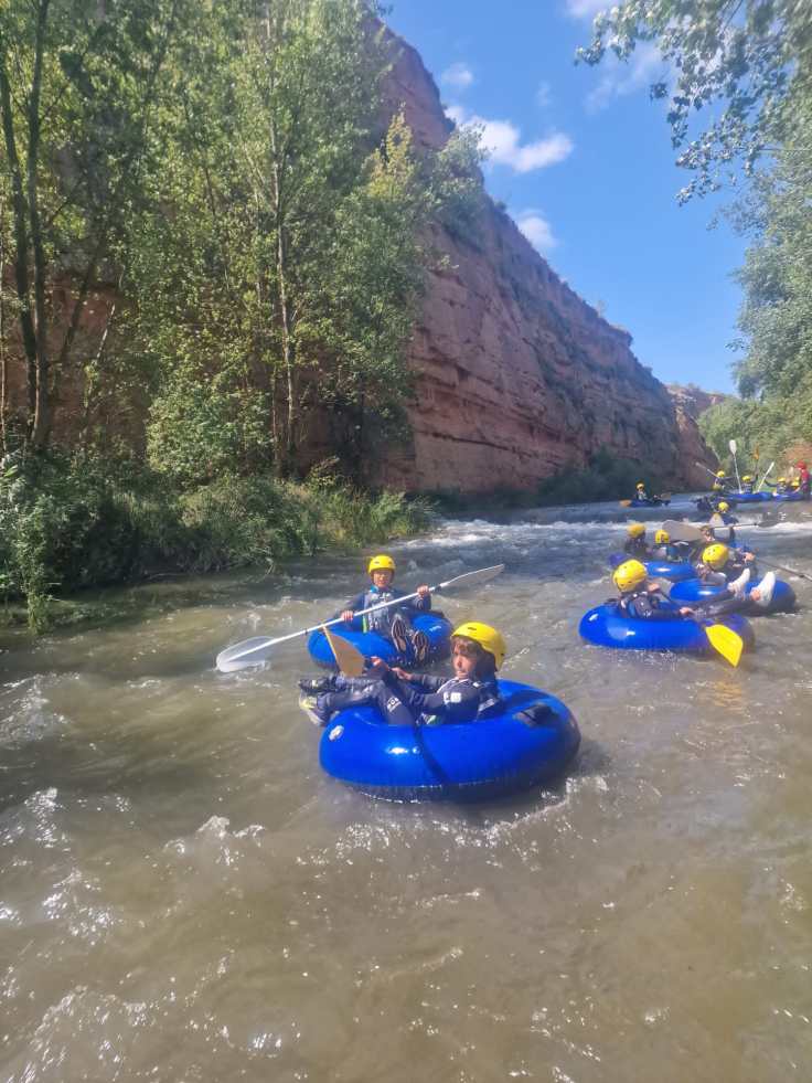 Hemos desayunado un batido de chocolate, un croissant y un trozo de bizcocho casero que nos han preparado los cocineros Marta y Raúl. ¡Estaba riquísimo! Tras el desayuno, hemos recogido las esterillas y sacos y, han preparado sus mochilas, se han puesto el bañador y las deportivas para realizar la novedosa actividad de Moscaventur: Rivertubbing. En esta actividad cada acampado y monitor se han apropiado, de forma individual, de una barca-canoa hinchable y han ido flotando y remando río abajo. ¡Nos ha encantado! Volvimos a las piscinas de Arnedillo y en la hora de comer nos han traído nuestros cocineros Marta y Raúl, unos ricos macarrones con tomate y trozos de seres malignos. ¡Qué ricos estaban!