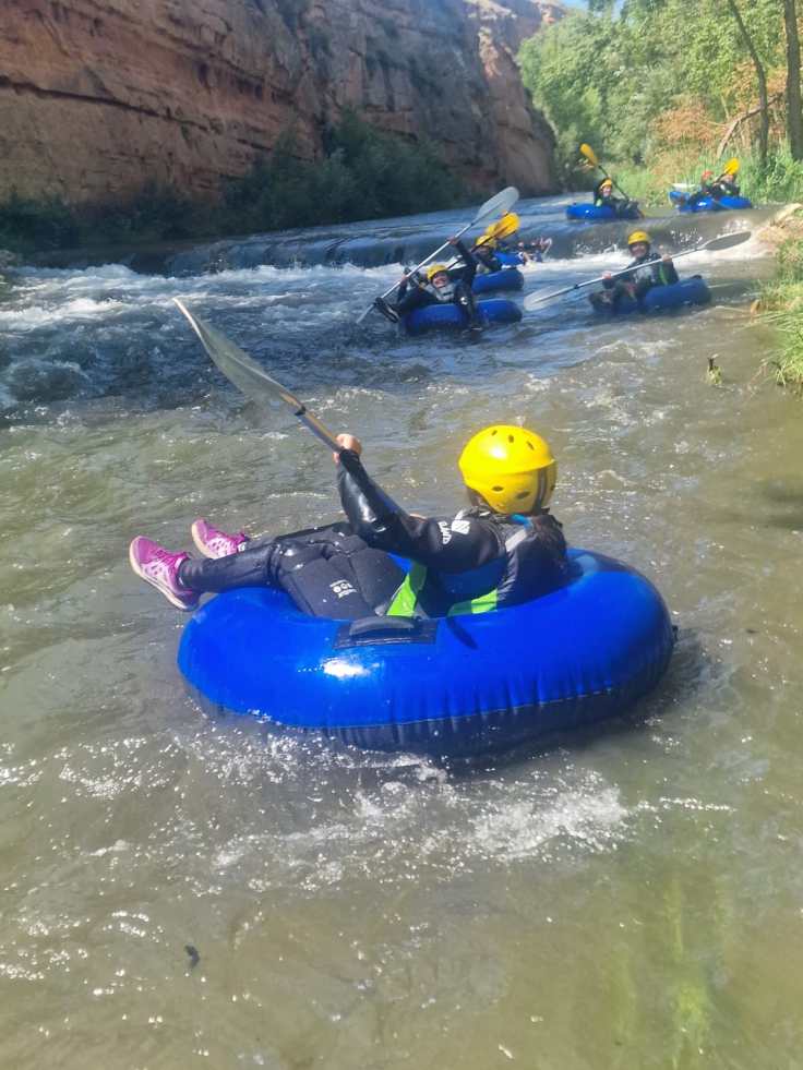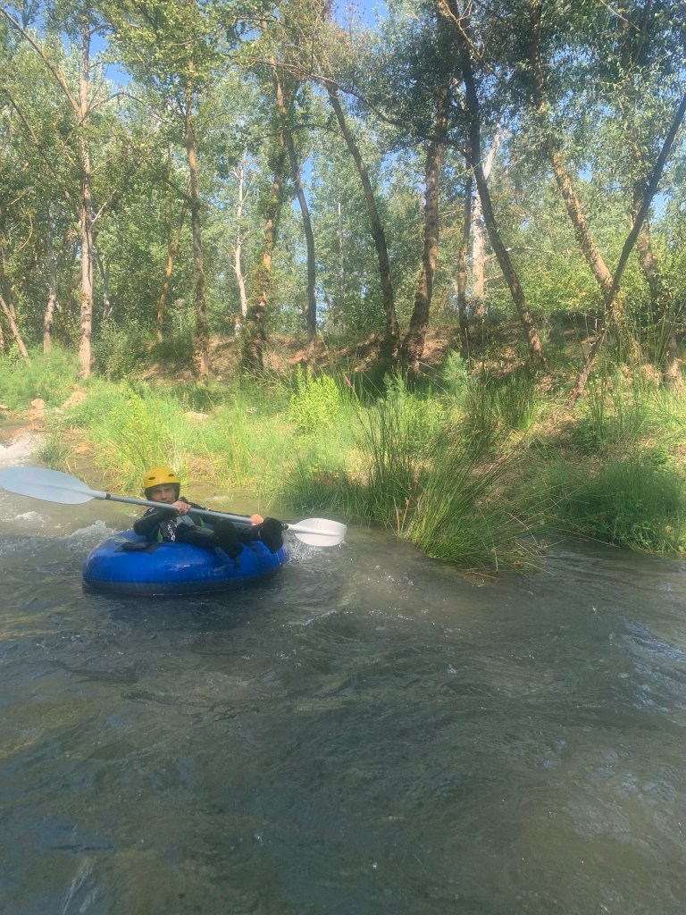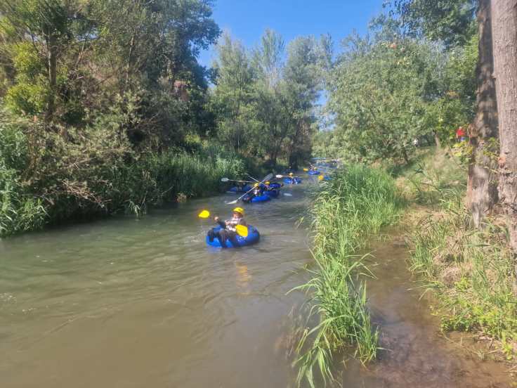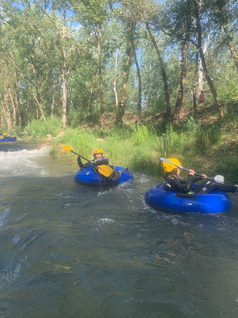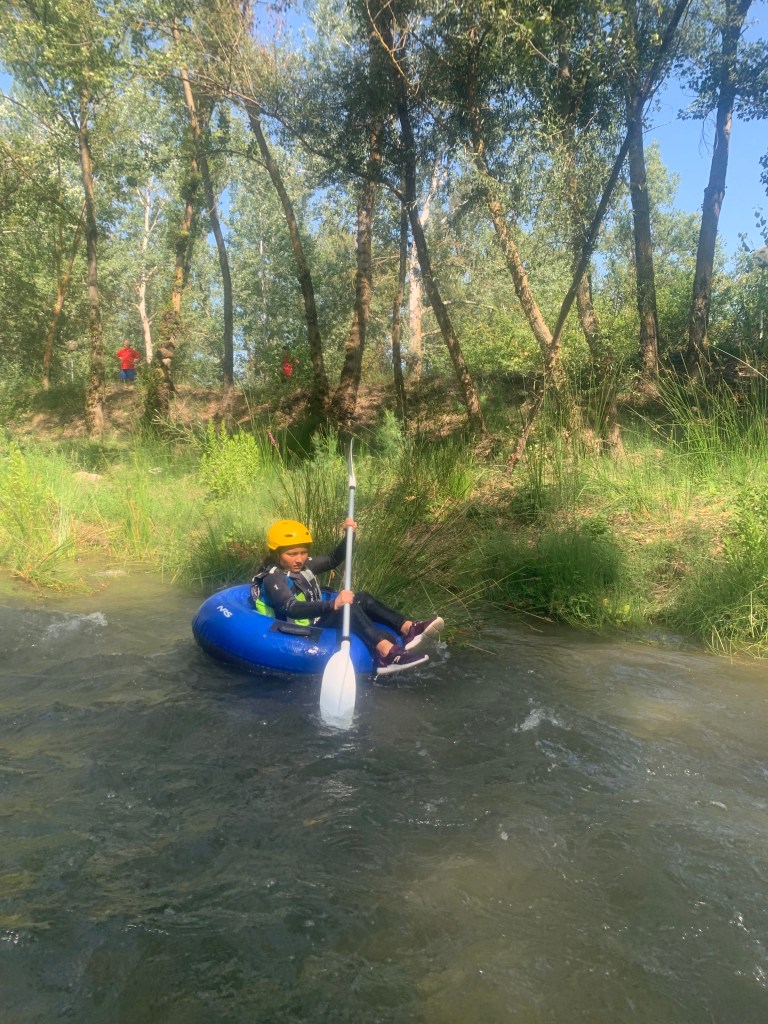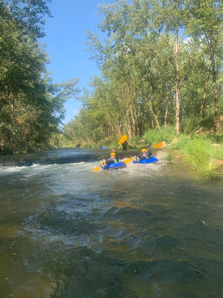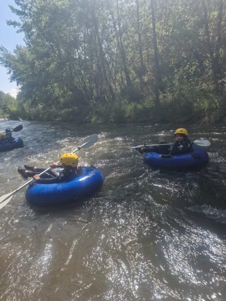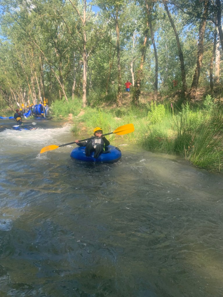 Hemos desayunado un batido de chocolate, un croissant y un trozo de bizcocho casero que nos han preparado los cocineros Marta y Raúl. ¡Estaba riquísimo! Tras el desayuno, hemos recogido las esterillas y sacos y, han preparado sus mochilas, se han puesto el bañador y las deportivas para realizar la novedosa actividad de Moscaventur: Rivertubbing. En esta actividad cada acampado y monitor se han apropiado, de forma individual, de una barca-canoa hinchable y han ido flotando y remando río abajo. ¡Nos ha encantado! Volvimos a las piscinas de Arnedillo y en la hora de comer nos han traído nuestros cocineros Marta y Raúl, unos ricos macarrones con tomate y trozos de seres malignos. ¡Qué ricos estaban!