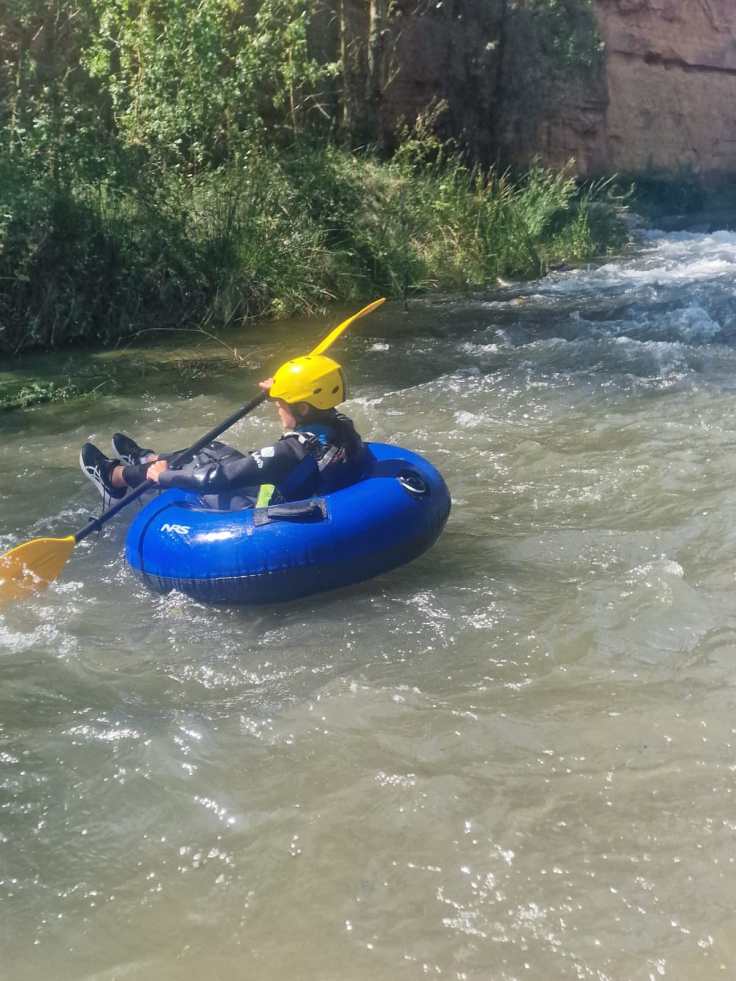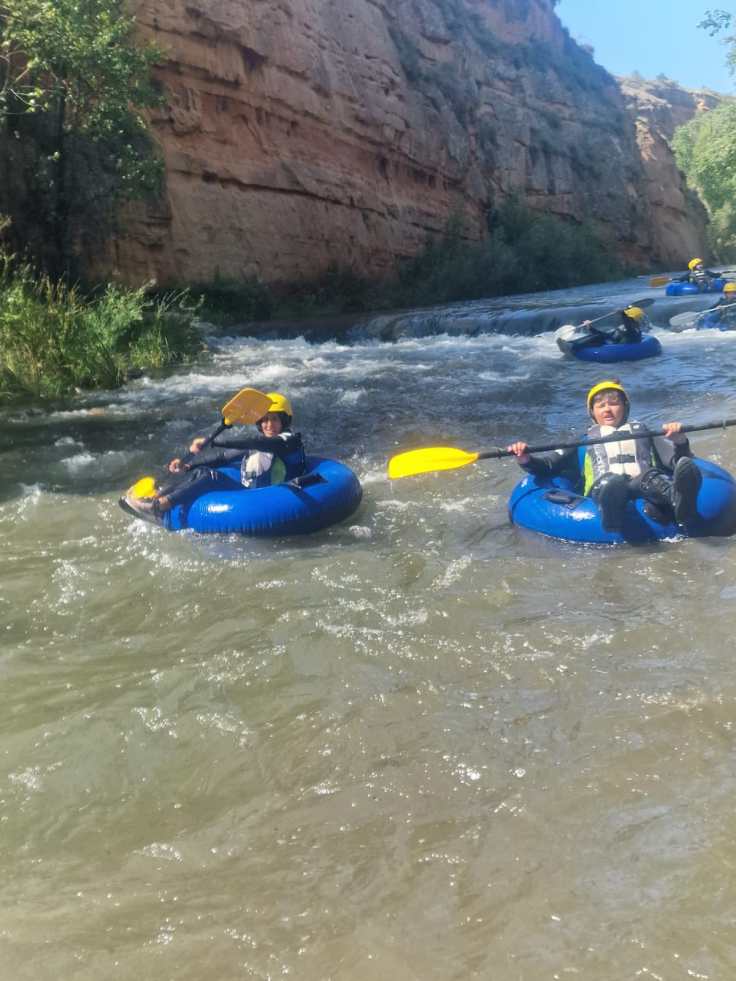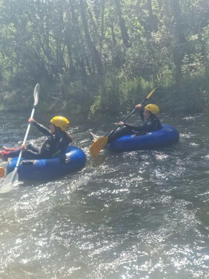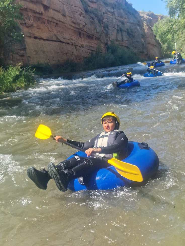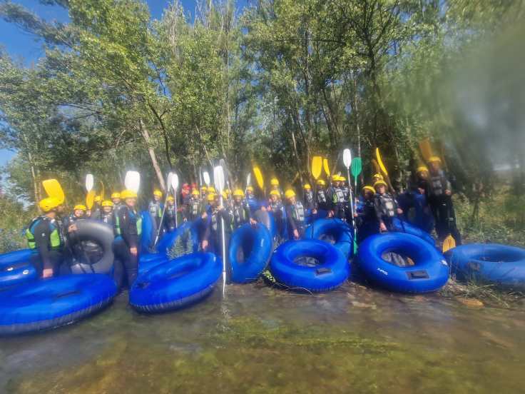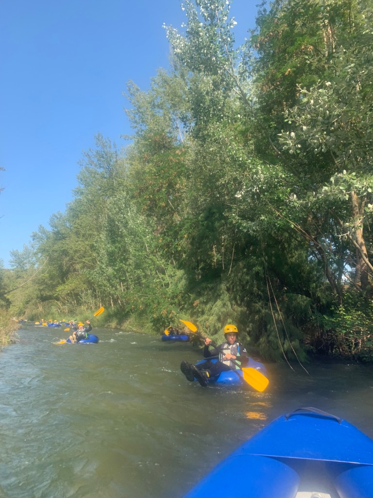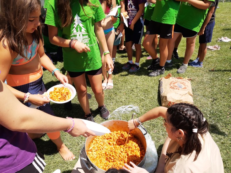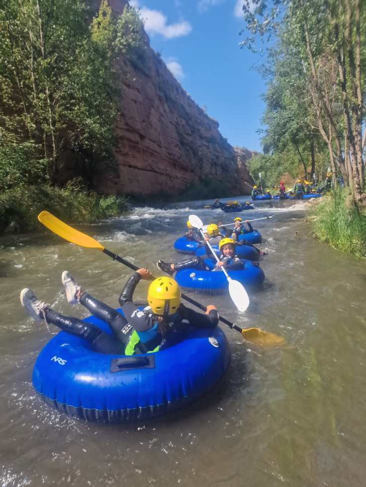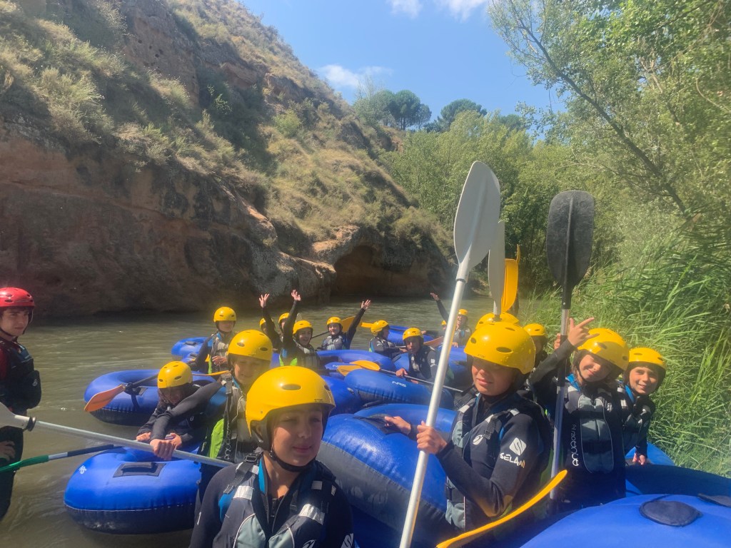 Hemos desayunado un batido de chocolate, un croissant y un trozo de bizcocho casero que nos han preparado los cocineros Marta y Raúl. ¡Estaba riquísimo! Tras el desayuno, hemos recogido las esterillas y sacos y, han preparado sus mochilas, se han puesto el bañador y las deportivas para realizar la novedosa actividad de Moscaventur: Rivertubbing. En esta actividad cada acampado y monitor se han apropiado, de forma individual, de una barca-canoa hinchable y han ido flotando y remando río abajo. ¡Nos ha encantado! Volvimos a las piscinas de Arnedillo y en la hora de comer nos han traído nuestros cocineros Marta y Raúl, unos ricos macarrones con tomate y trozos de seres malignos. ¡Qué ricos estaban!