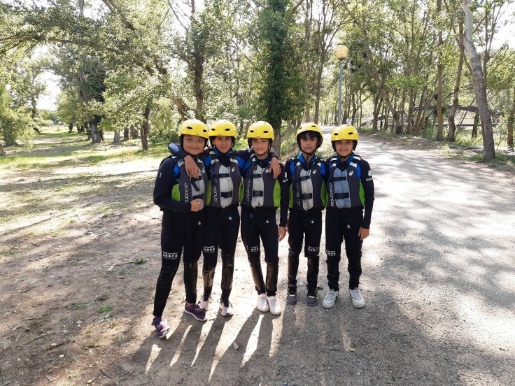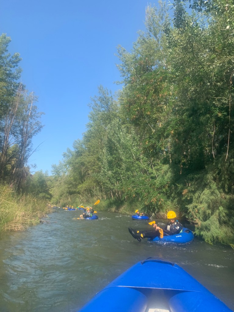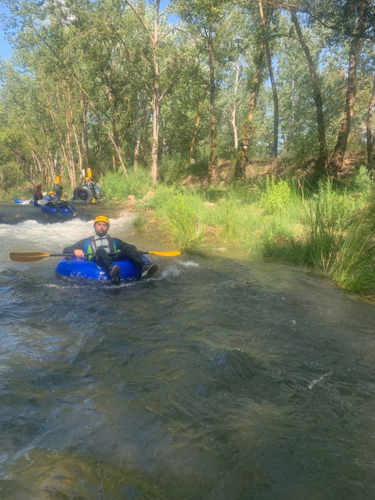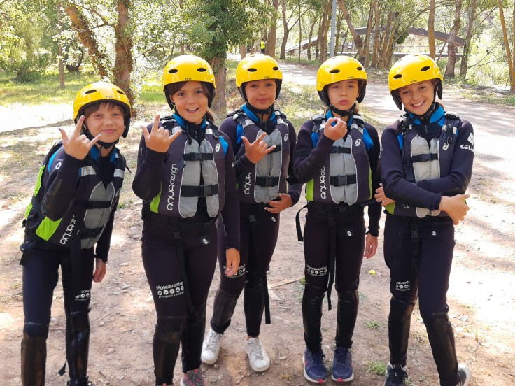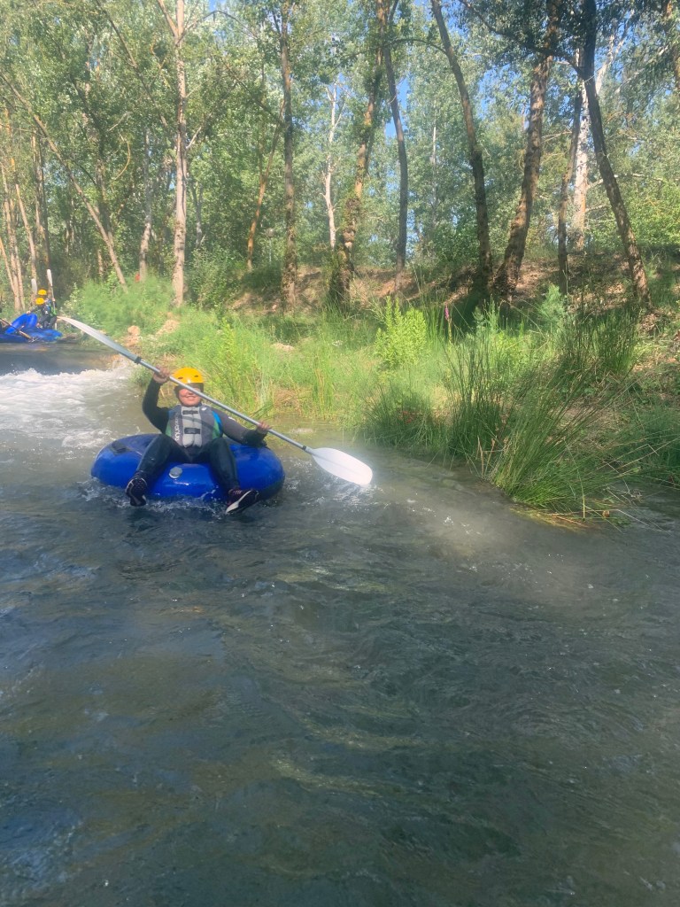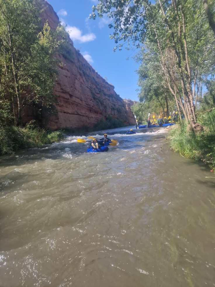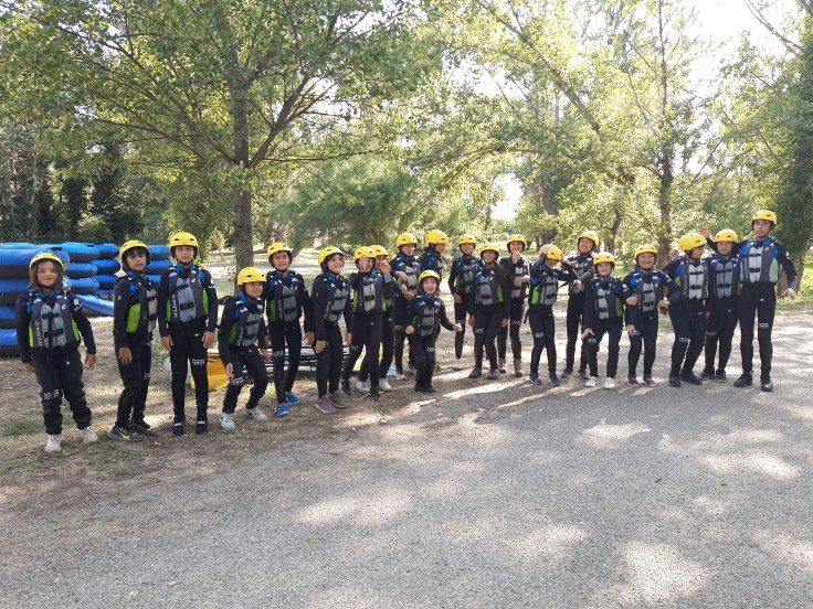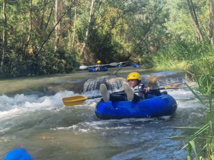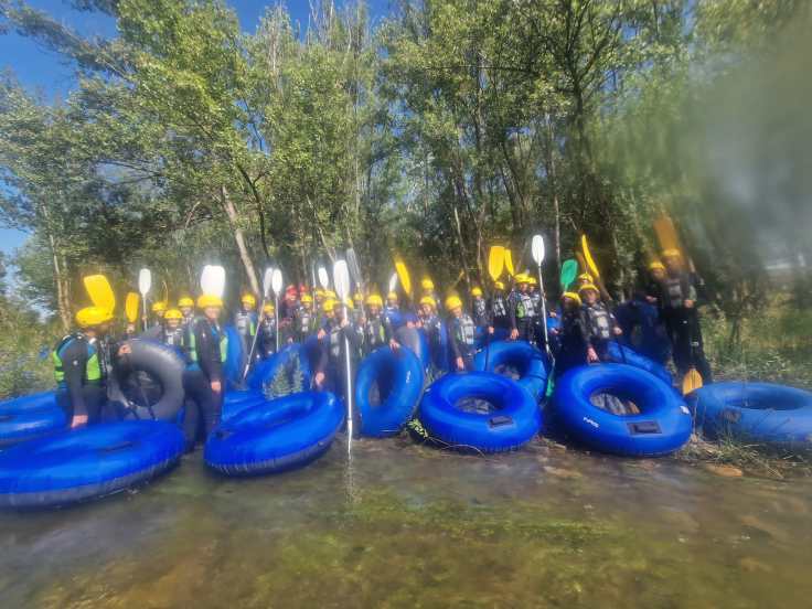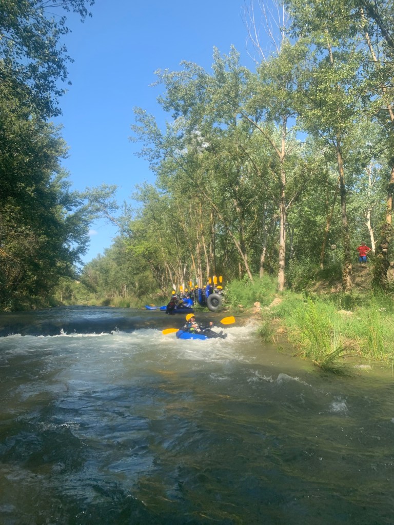 Hemos desayunado un batido de chocolate, un croissant y un trozo de bizcocho casero que nos han preparado los cocineros Marta y Raúl. ¡Estaba riquísimo! Tras el desayuno, hemos recogido las esterillas y sacos y, han preparado sus mochilas, se han puesto el bañador y las deportivas para realizar la novedosa actividad de Moscaventur: Rivertubbing. En esta actividad cada acampado y monitor se han apropiado, de forma individual, de una barca-canoa hinchable y han ido flotando y remando río abajo. ¡Nos ha encantado! Volvimos a las piscinas de Arnedillo y en la hora de comer nos han traído nuestros cocineros Marta y Raúl, unos ricos macarrones con tomate y trozos de seres malignos. ¡Qué ricos estaban!