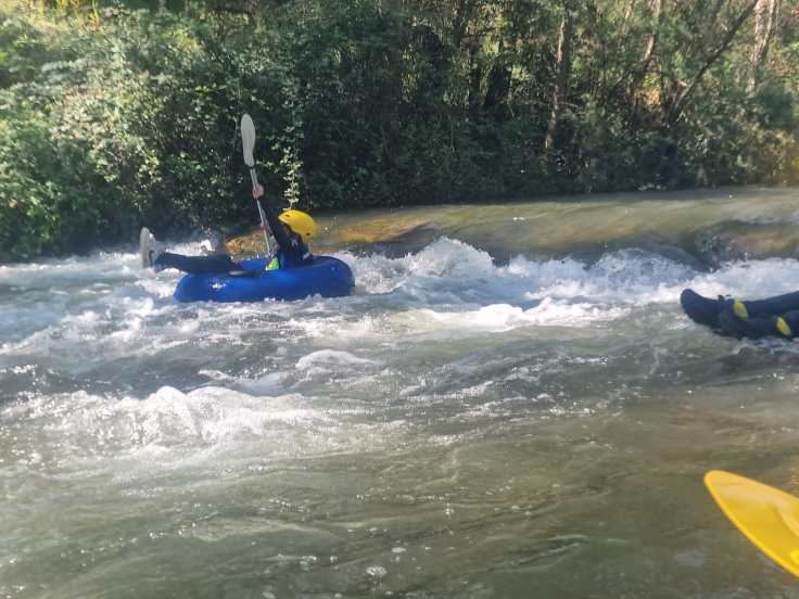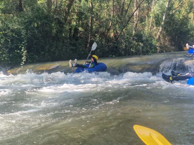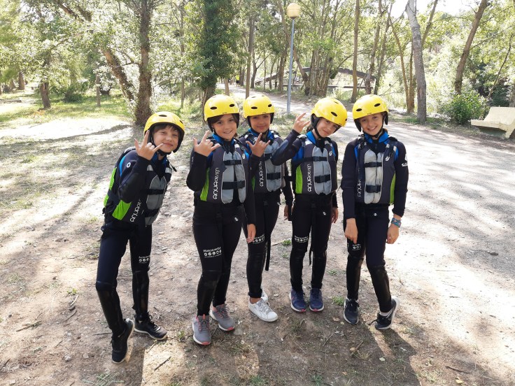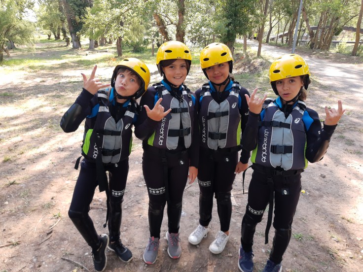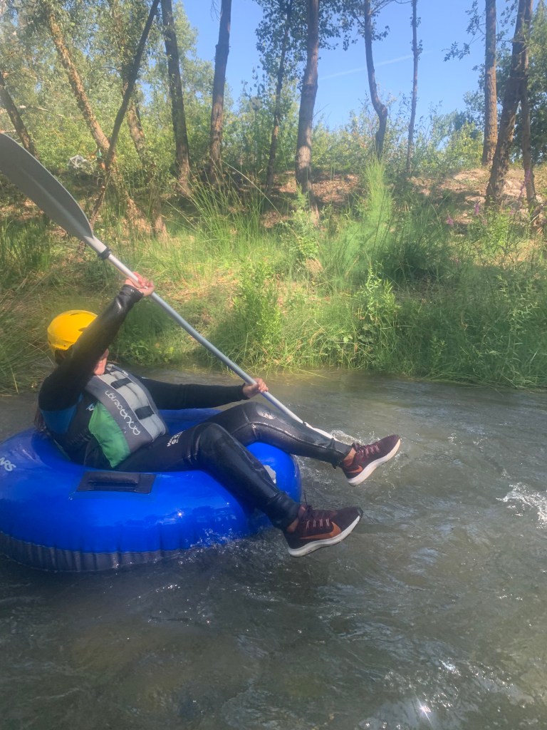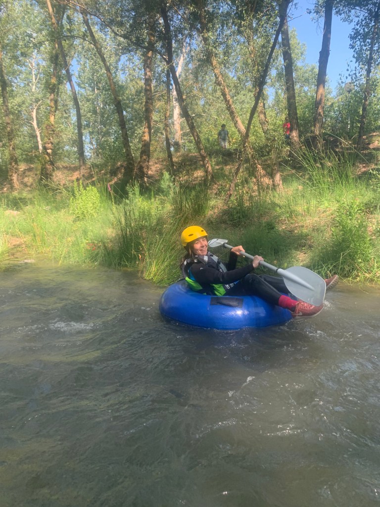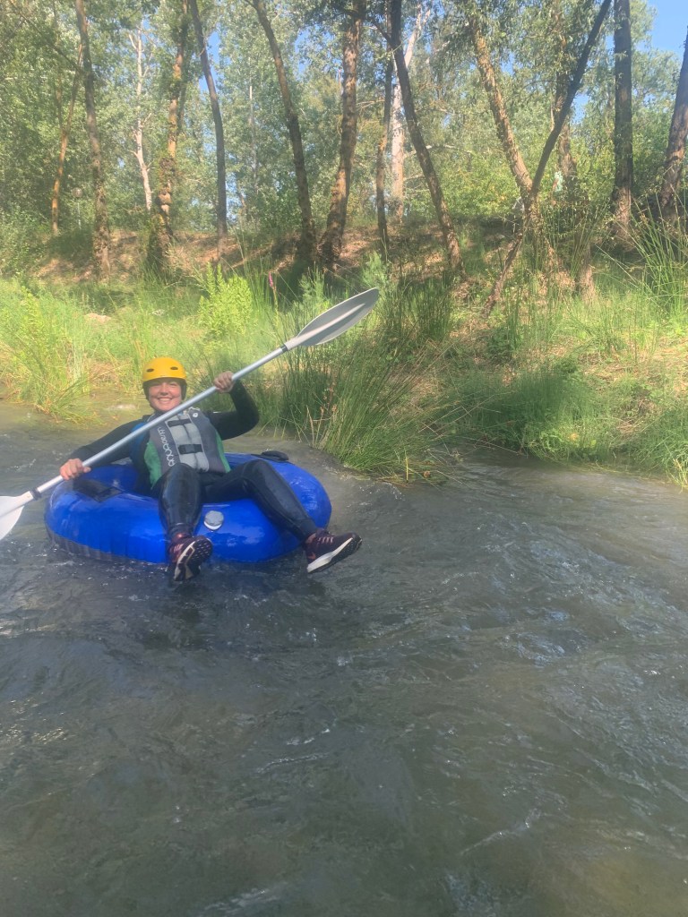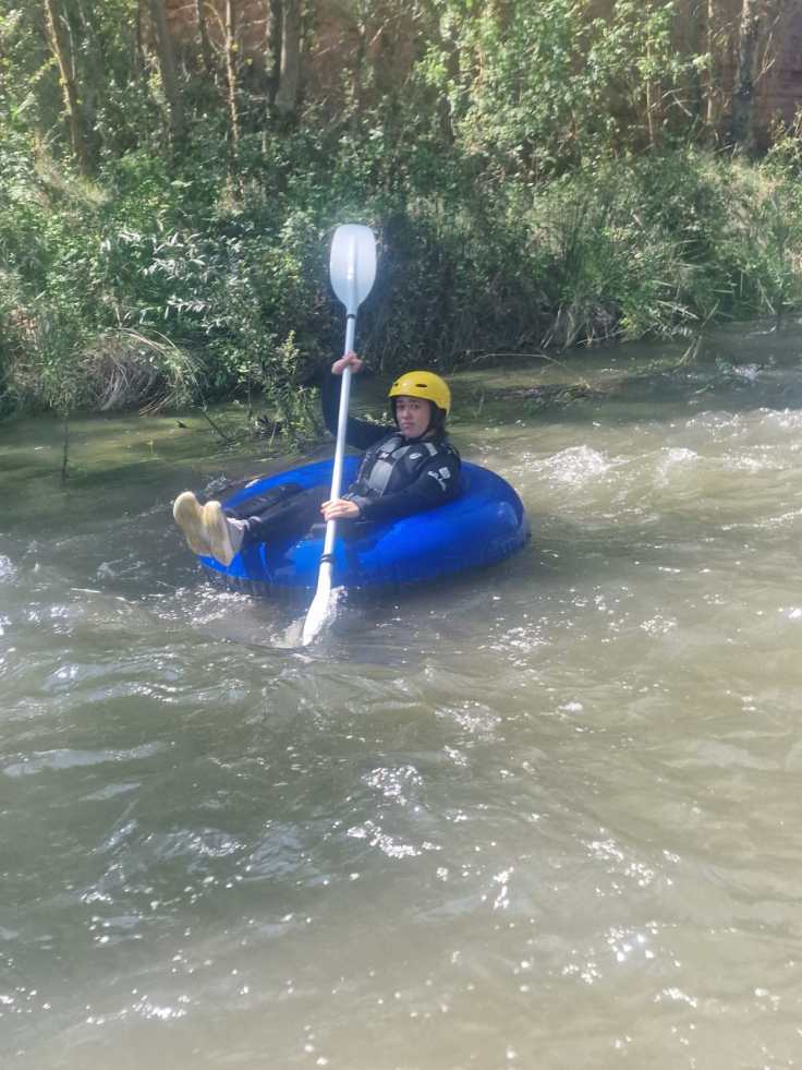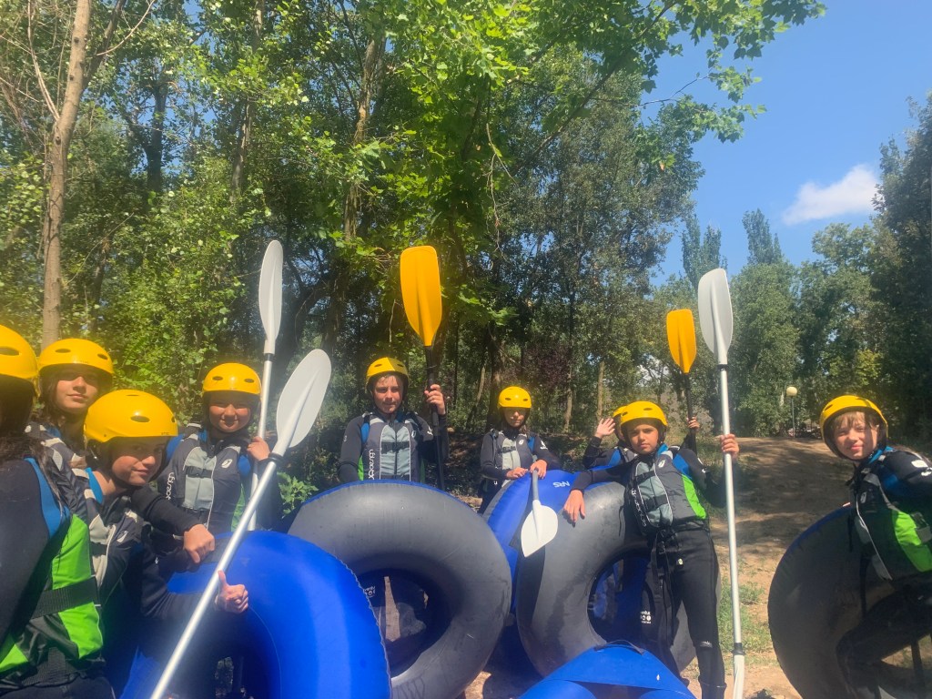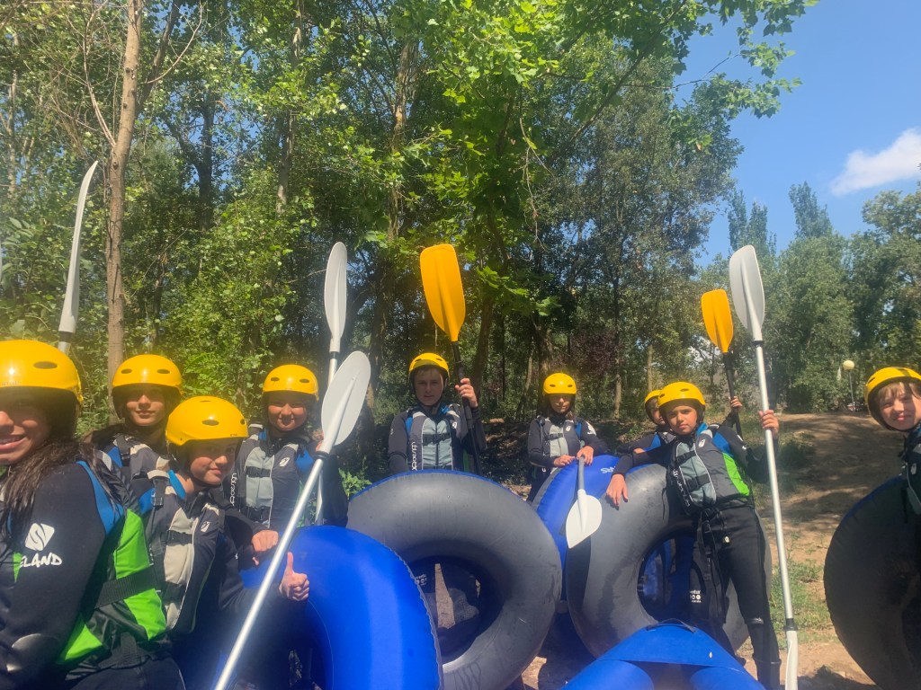 Hemos desayunado un batido de chocolate, un croissant y un trozo de bizcocho casero que nos han preparado los cocineros Marta y Raúl. ¡Estaba riquísimo! Tras el desayuno, hemos recogido las esterillas y sacos y, han preparado sus mochilas, se han puesto el bañador y las deportivas para realizar la novedosa actividad de Moscaventur: Rivertubbing. En esta actividad cada acampado y monitor se han apropiado, de forma individual, de una barca-canoa hinchable y han ido flotando y remando río abajo. ¡Nos ha encantado! Volvimos a las piscinas de Arnedillo y en la hora de comer nos han traído nuestros cocineros Marta y Raúl, unos ricos macarrones con tomate y trozos de seres malignos. ¡Qué ricos estaban!