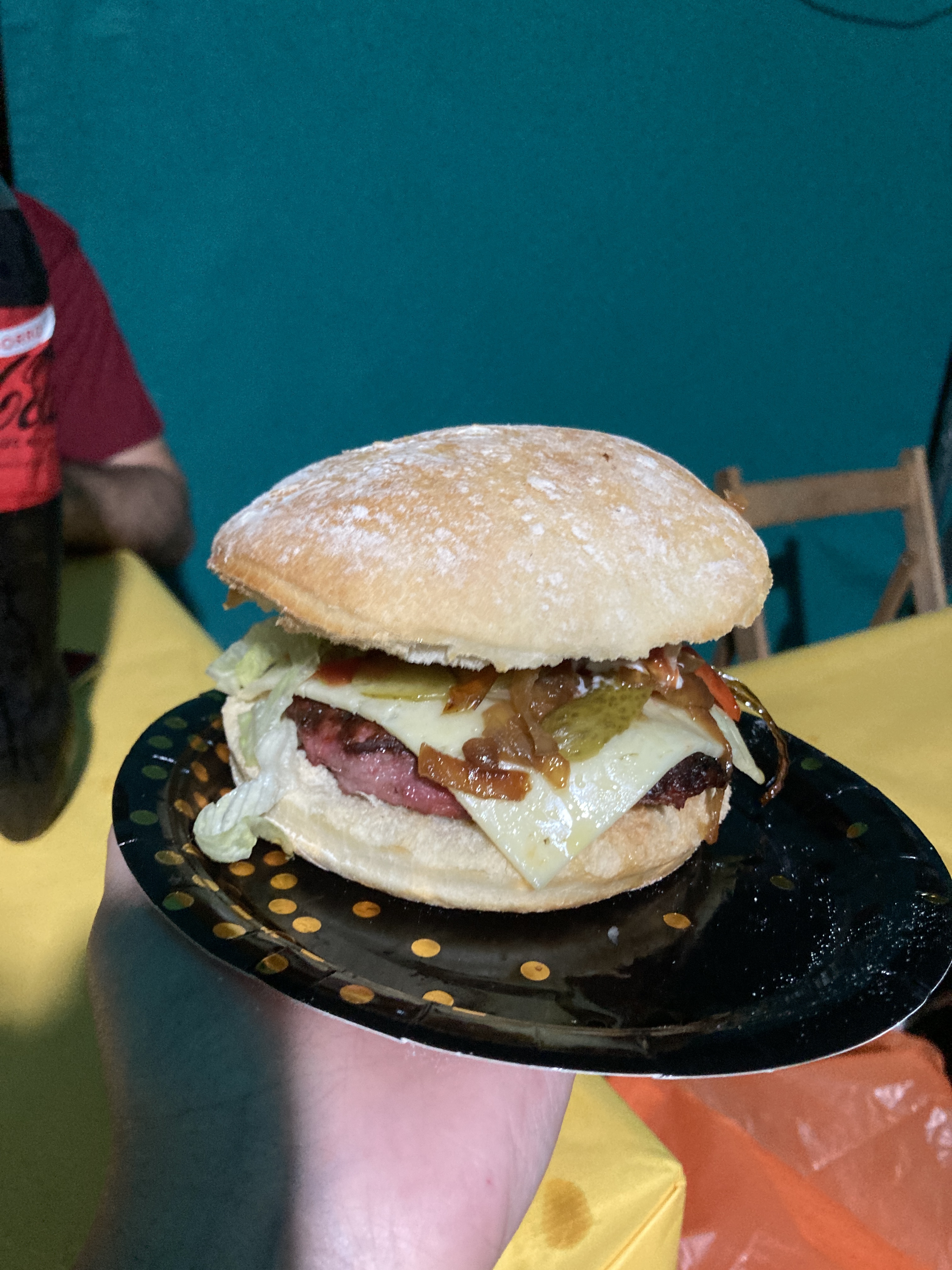 Cuando comenzó a sonar la música («Potra salvaje», cómo no) empezamos a desfilar por una mini alfombra roja. La cena fue menos glamurosa pero sabrosísima: hamburguesas con bacon, cebolla, lechuga, pepinillo… no le faltaba de nada.